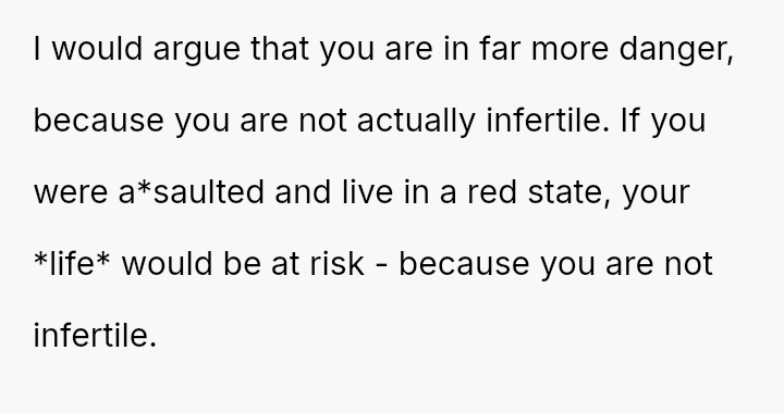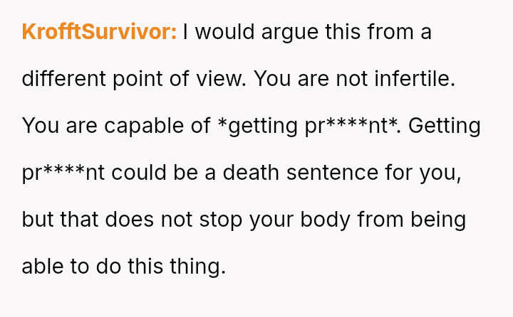 Given the OP's physical reality where pregnancy poses a life-threatening risk, is it appropriate and accurate for them to use the term 'infertile' to describe their condition, or does the coworker's argument regarding emotional struggle and intent invalidate the OP's descriptive label?