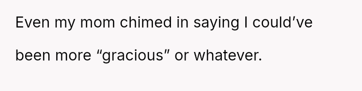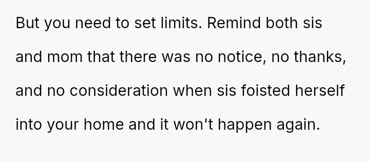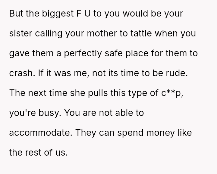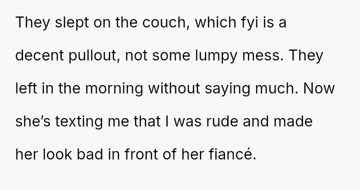 Following their departure the next morning, the sister accused the OP of being rude and embarra*sing her in front of her fiancé, with the OP's mother also suggesting the OP should have been more gracious, leading the OP to question if her actions were unjustified.