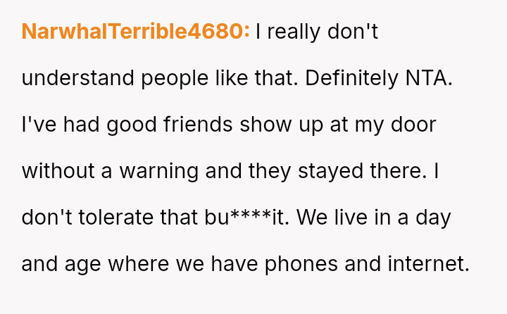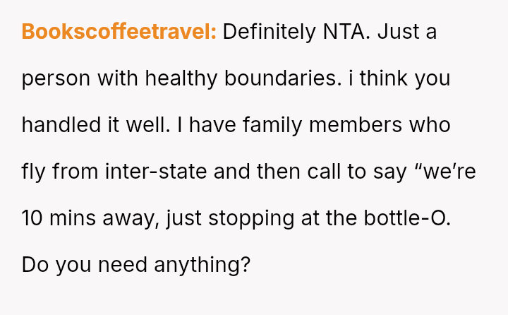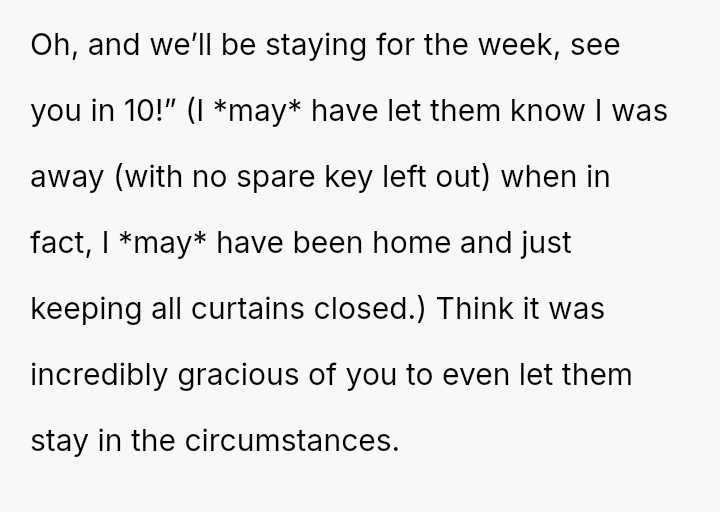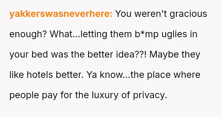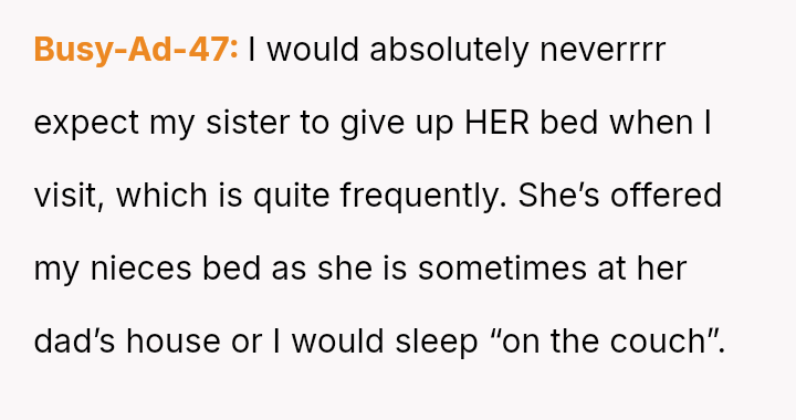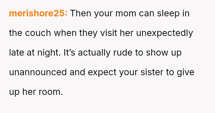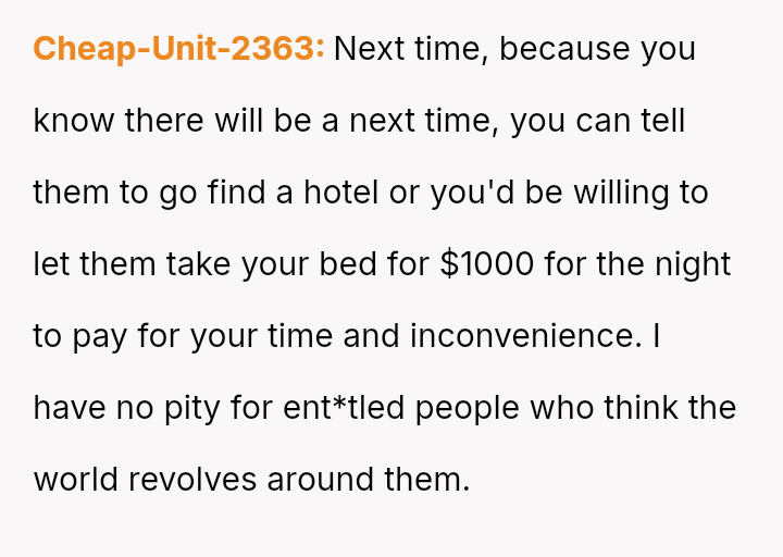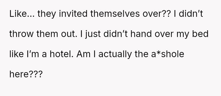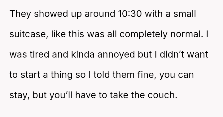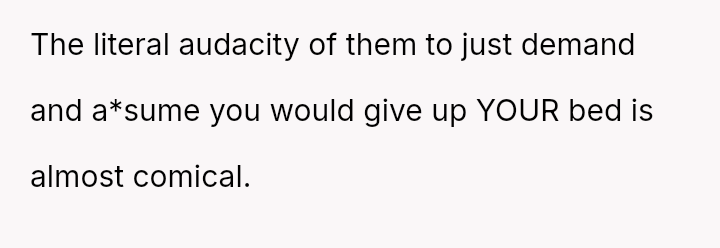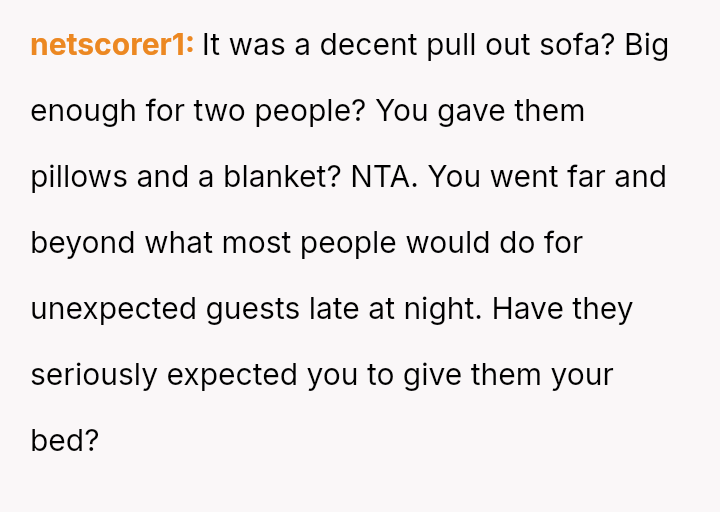 Although annoyed, the OP allowed them to stay but insisted they use the pull-out couch, refusing to give up her own bed.