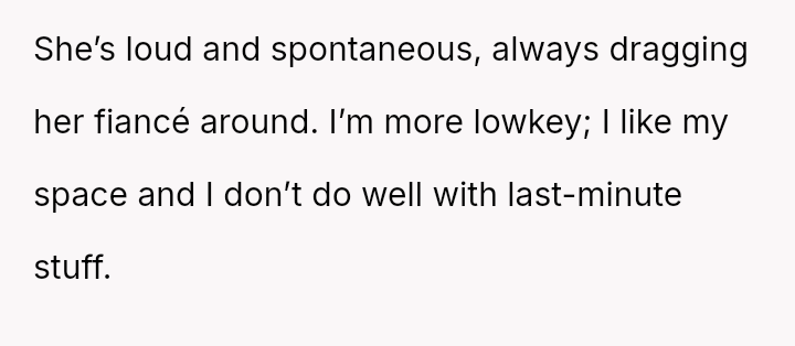The central conflict revolves around the OP es**blishing and defending her personal boundaries against an unwelcome, last-minute intrusion into her private space by her sister and fiancé.