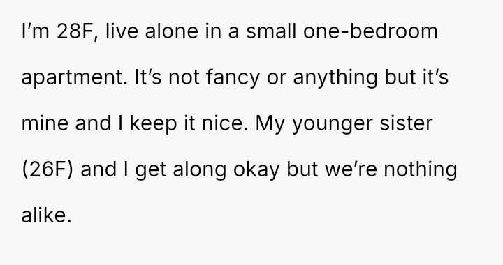 The original poster (OP), a 28-year-old woman living alone, has a younger sister (26F) who is described as loud and spontaneous, contrasting with the OP's preference for a low-key lifestyle and personal space.