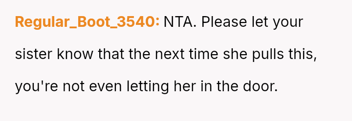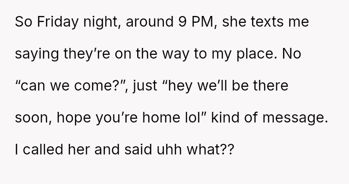 The conflict began late on a Friday night when the sister texted around 9 PM, stating she and her fiancé were on their way to the OP's apartment, framing it as a certainty rather than a request.