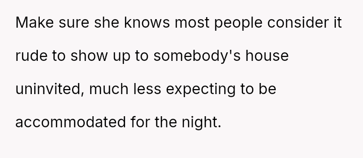 When the OP questioned this last-minute plan, the sister insisted they needed a place to crash for the night and arrived shortly after, ignoring the OP's expressed reluctance.