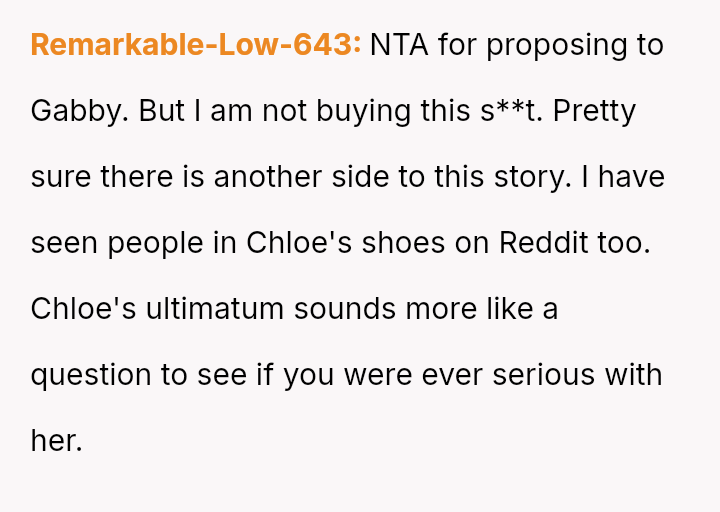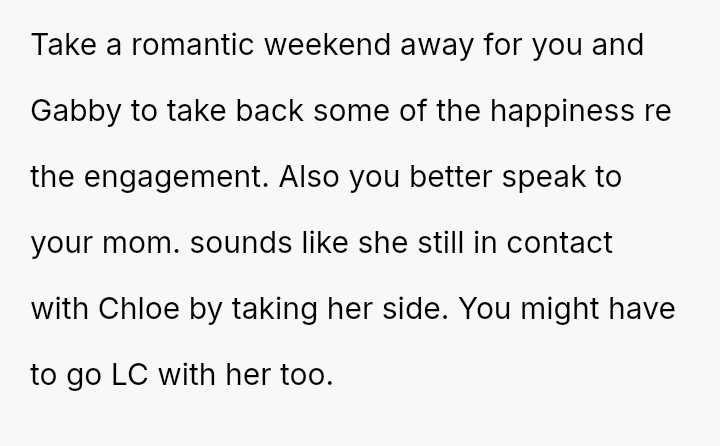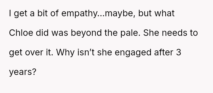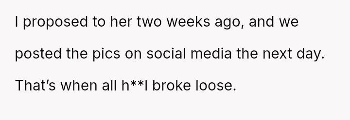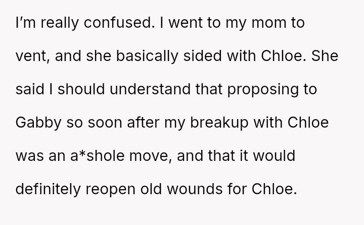 The original poster (OP) is facing significant emotional fallout after announcing his engagement, as his ex-partner, Chloe, and even his own mother, believe his actions were insensitive and hurtful to Chloe.