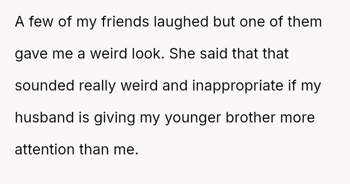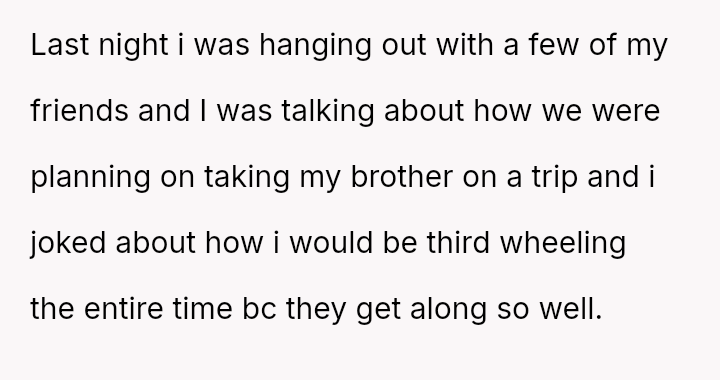 The OP mentioned to friends how she joked about being a third wheel because her husband and her younger brother, who share a close bond as the only males in their respective immediate circles, get along exceptionally well.