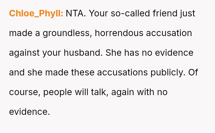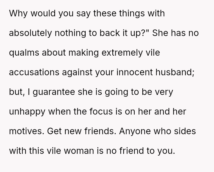 The situation presents two opposing views: was the OP right to immediately defend her husband against a serious, unfounded accusation, or should she have calmly addressed the friend's concerns, even if they were offensive? How should the OP address the ongoing tension in the group chat and her friend's statement?