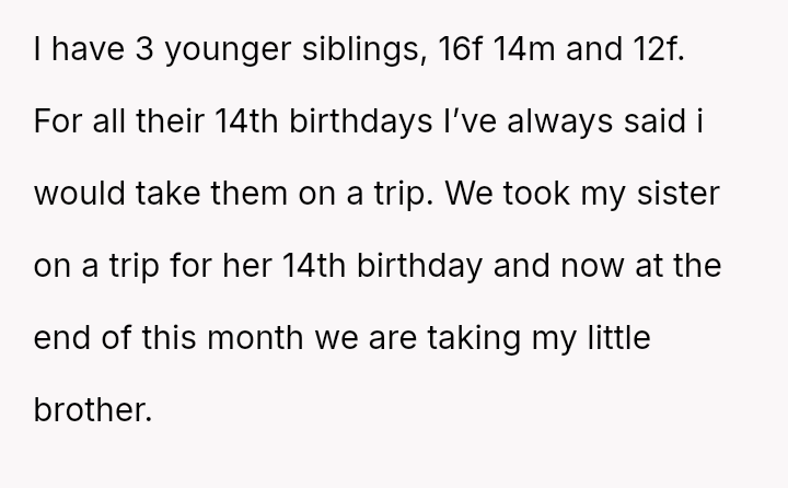 The OP has three younger siblings, and she made a promise to take each of them on a trip for their 14th birthdays. After taking her sister, she is now planning a trip with her younger brother.