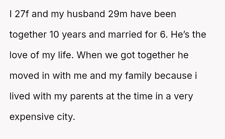 The original poster (OP), a 27-year-old woman, has been with her 29-year-old husband for ten years and married for six. When they first got together, the husband moved in with the OP and her parents in an expensive city where she lived at the time.