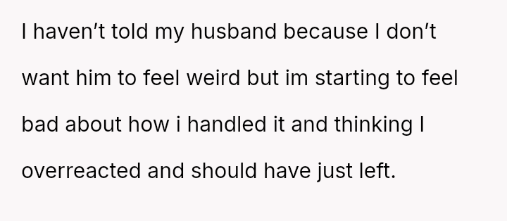 The poster is now experiencing significant distress, regretting her strong reaction and feeling she may have overreacted by immediately leaving the gathering.