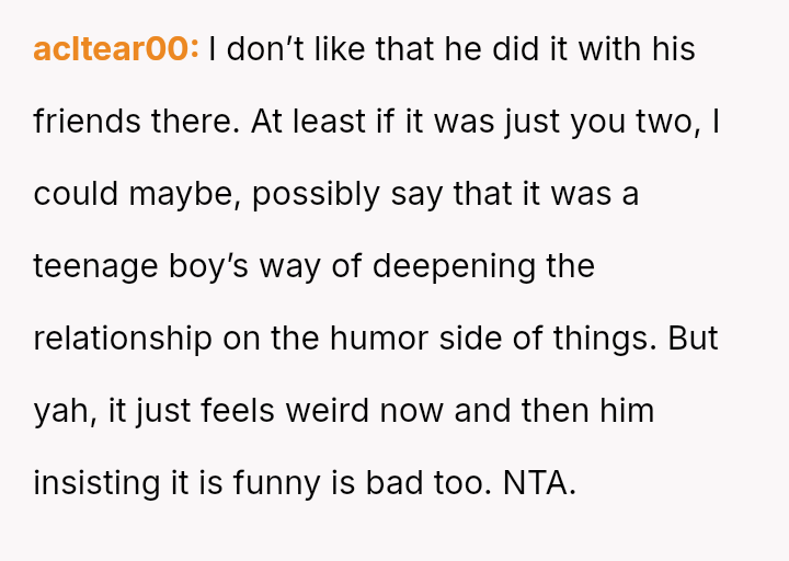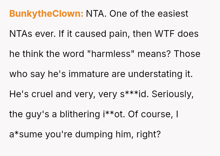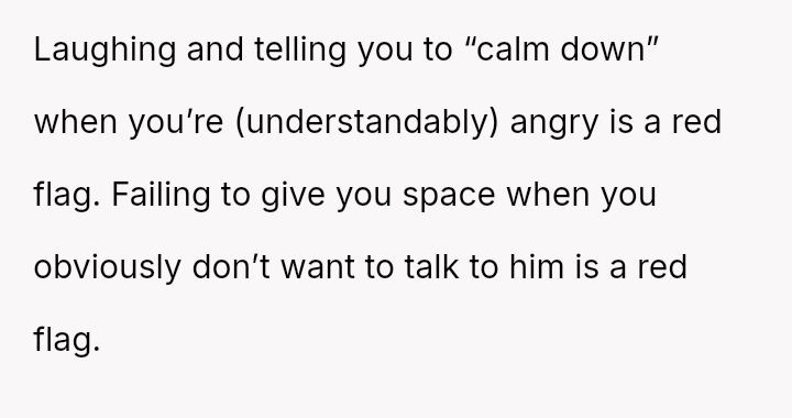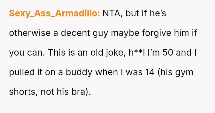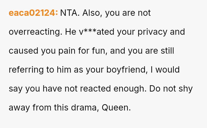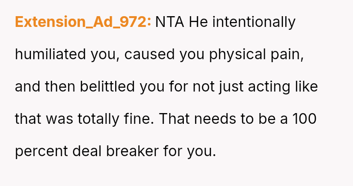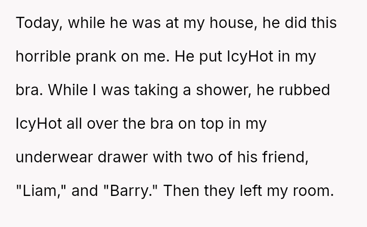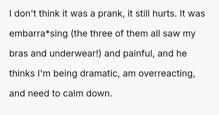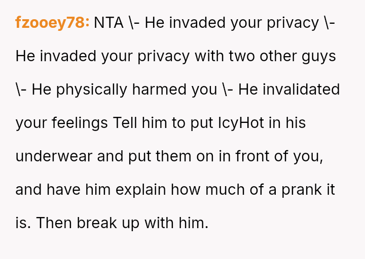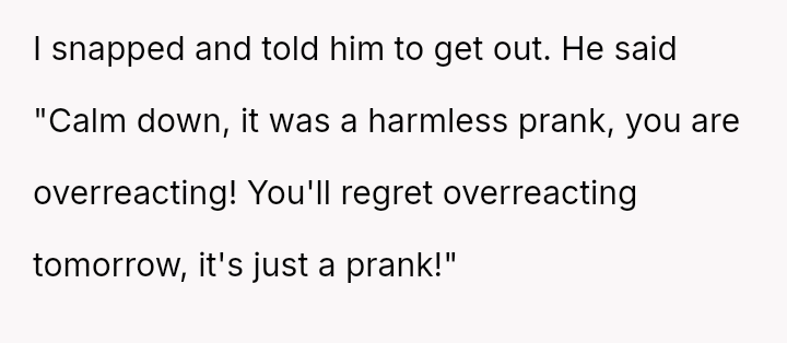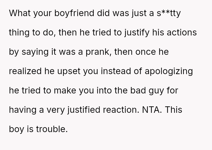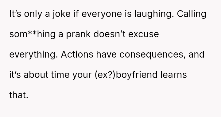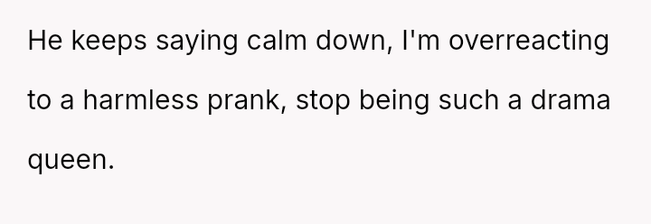 Given the severe nature of the physical discomfort and the boyfriend's dismissal of her reaction, the core question remains: Can an act causing physical pain and humiliation truly be cla*sified as a harmless prank, and does the victim's negative reaction justify the perpetrator's insistence that they 'calm down'?