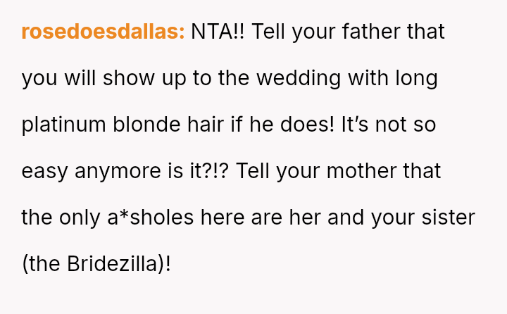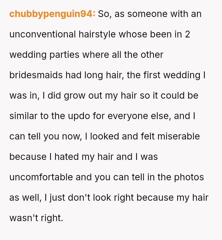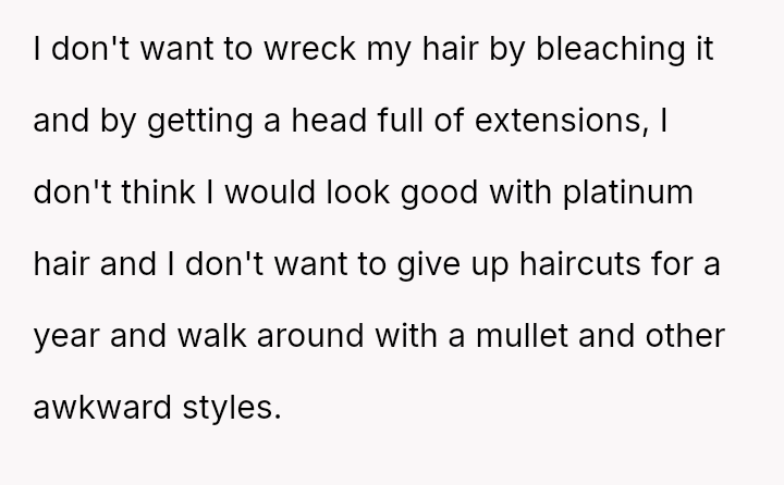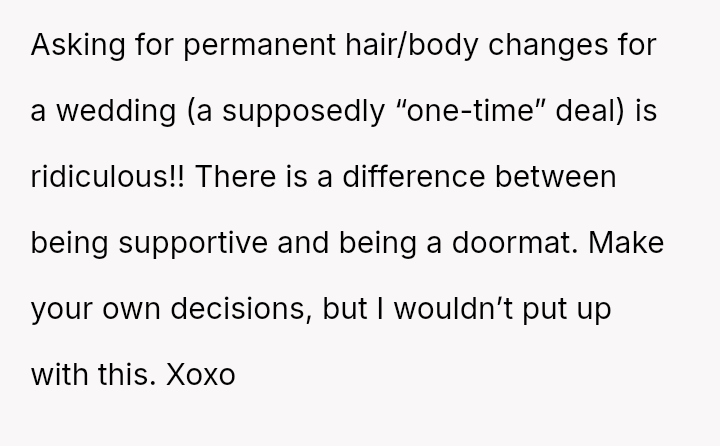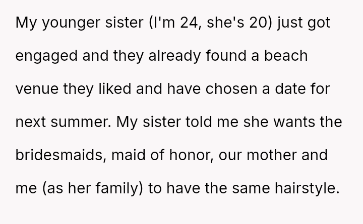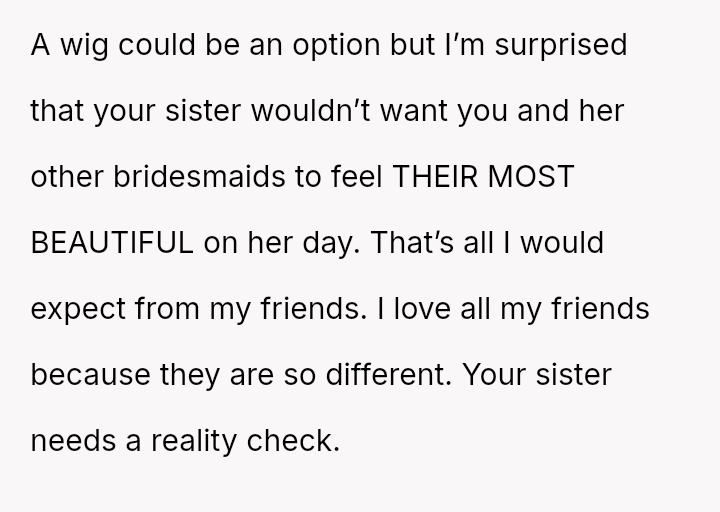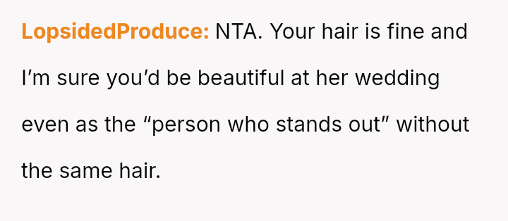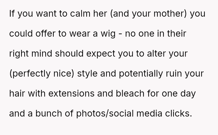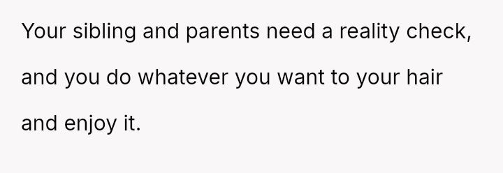 Given the deeply personal nature of physical appearance versus the desire to honor a family milestone, the core question remains: Does a sibling have the right to demand significant, long-term physical alteration from a non-participating adult for the sake of aesthetic uniformity in wedding photos, or is the OP's right to bodily autonomy and hair health paramount?