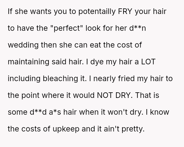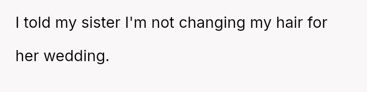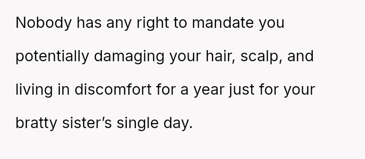 The central conflict arises from the OP's firm decision to maintain their es**blished personal style and hair health against the demands of their family, who view this refusal as a lack of support for the sister's special day.