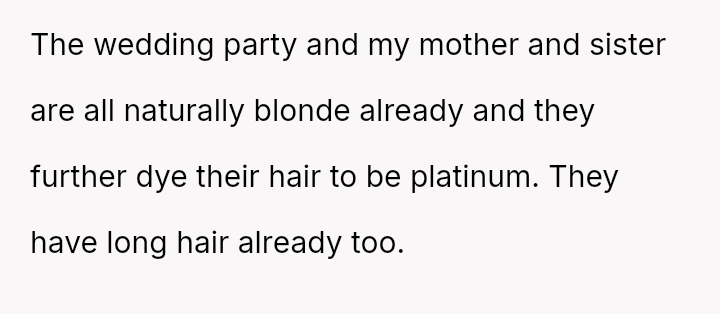 The original poster (OP) is facing significant pressure from their sister and mother to drastically alter their appearance for a wedding, specifically by growing out and bleaching their hair to match the bridal party.