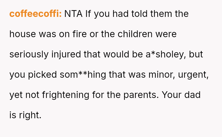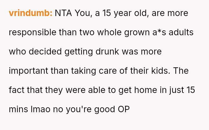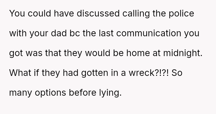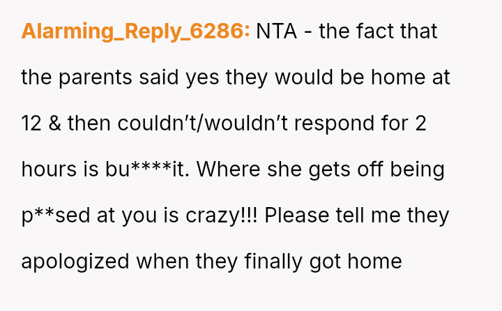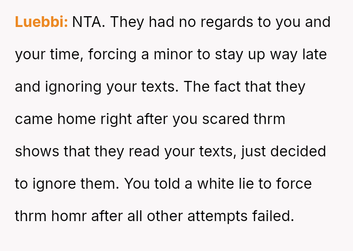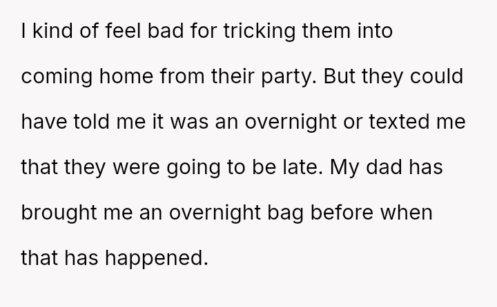 The 15-year-old babysitter felt justified in using a deceptive tactic to prompt the parents' return after they significantly exceeded the agreed-upon pickup time without communication, leading to frustration for both the sitter and her father.
