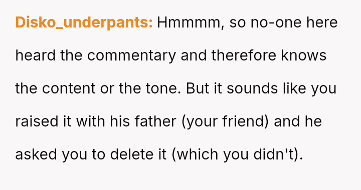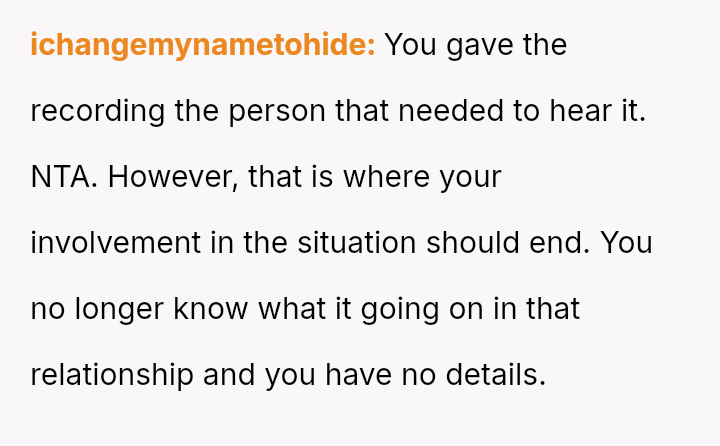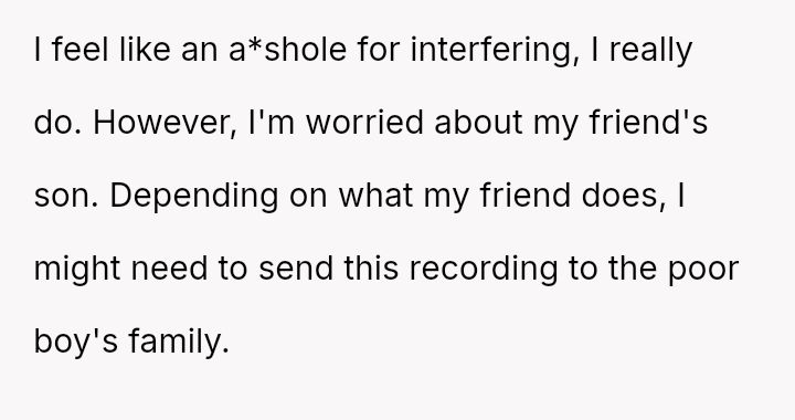 The core question for debate is whether the user's actions of recording and sharing the sensitive conversation were an unjustified intrusion into the friend's personal life, or if this intervention was a necessary, albeit difficult, step to protect the well-being of the child involved. Should the recording be deleted as requested, or kept as leverage?