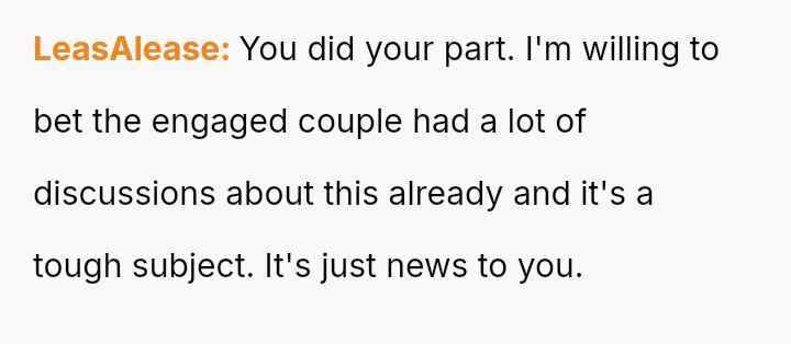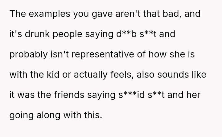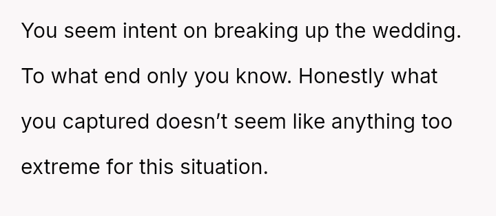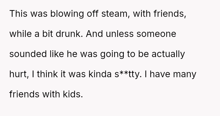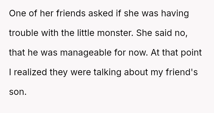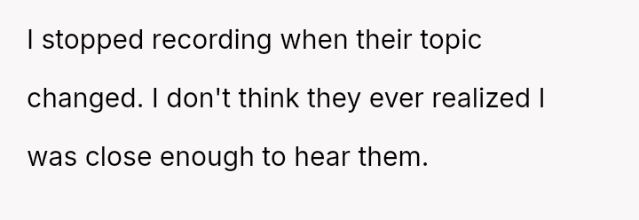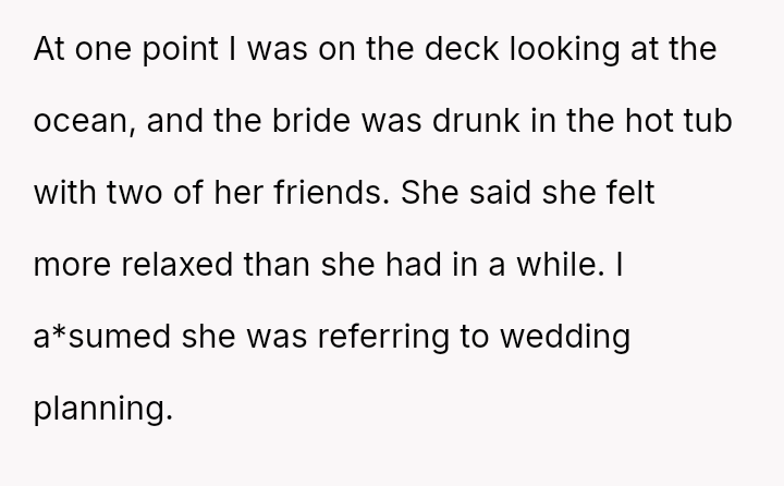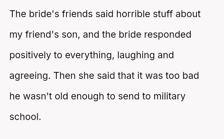 During the party, the user overheard the bride and two friends speaking negatively about the friend's young son while they were in the hot tub. The user secretly recorded a portion of this conversation where the bride agreed with critical remarks.