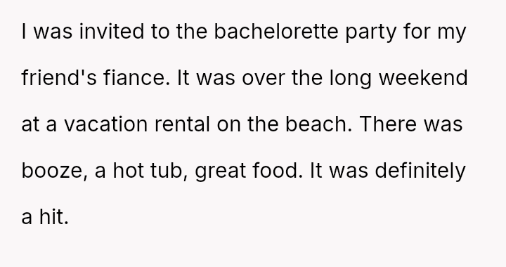 The user attended a bachelorette party for a friend's fiancée, which took place over a long weekend at a beach vacation rental. The event included typical celebratory activities like enjoying food, drinks, and using a hot tub.