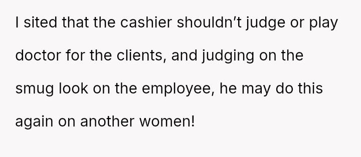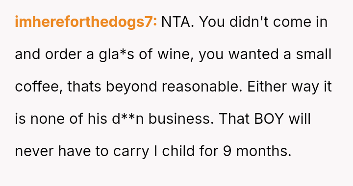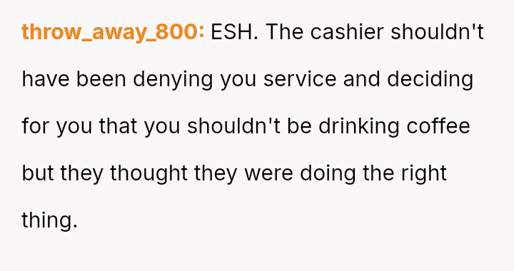 The original poster (OP) experienced significant emotional distress due to the cashier's unso***ited judgment about her limited caffeine intake during her late pregnancy.