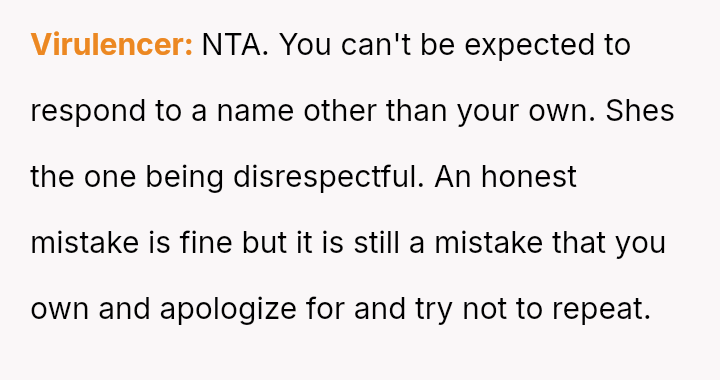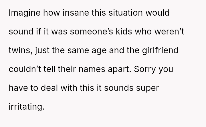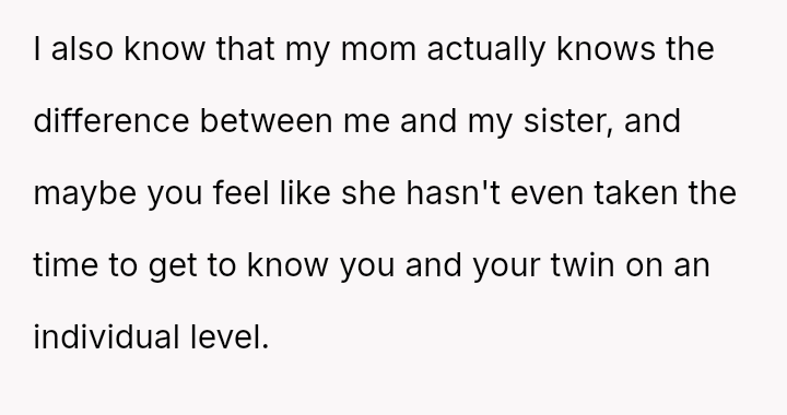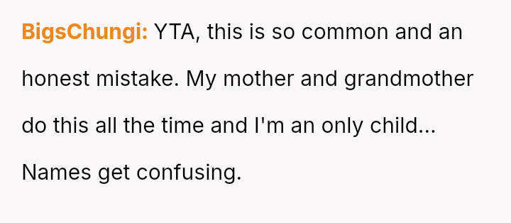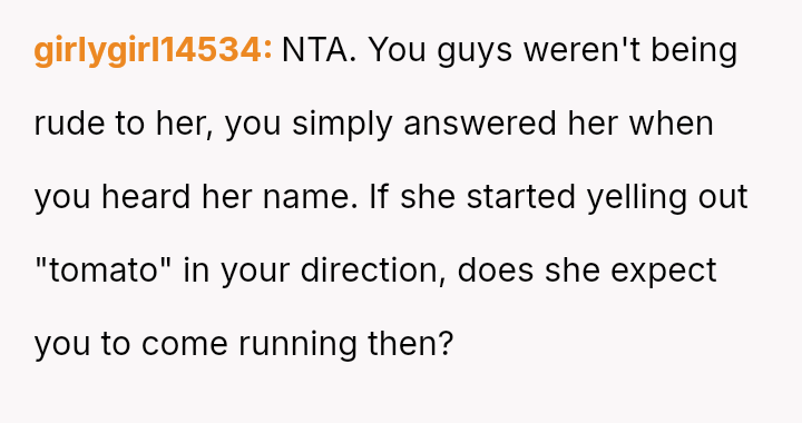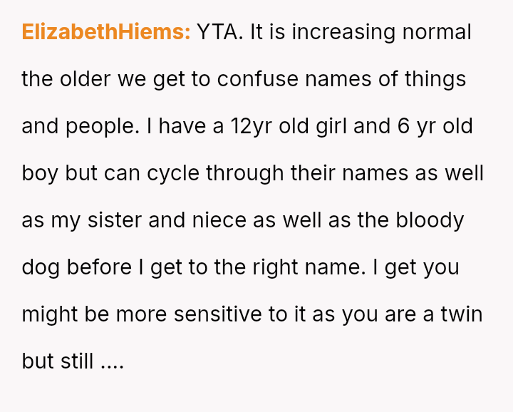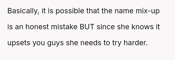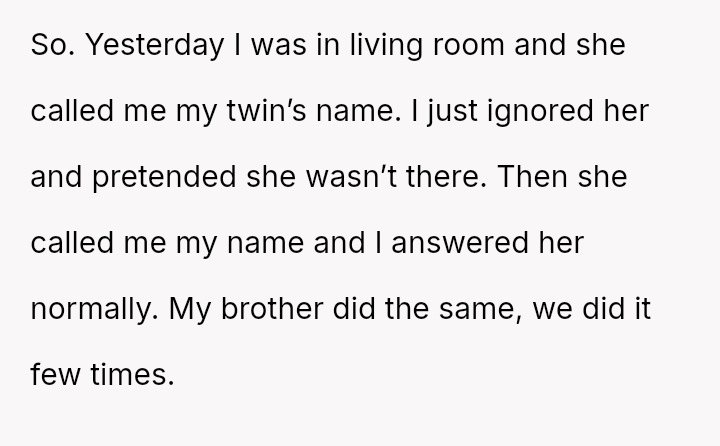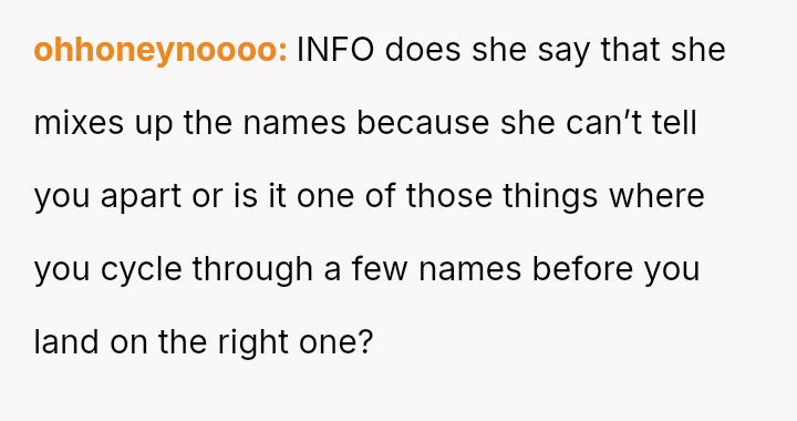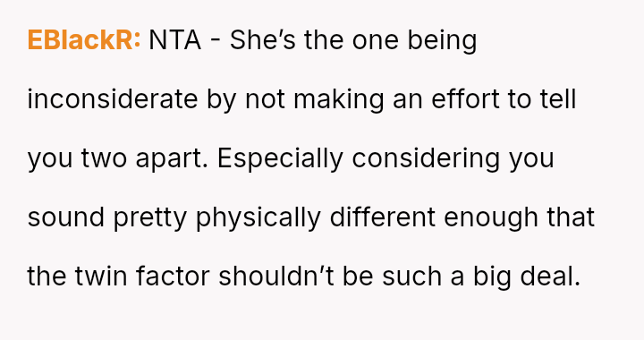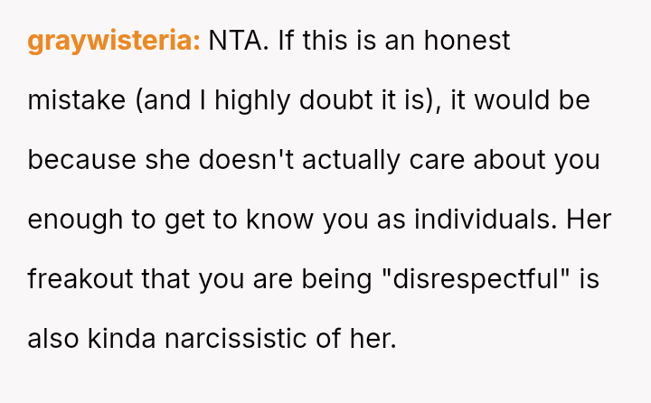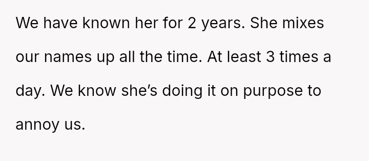 The original poster and their twin feel intentionally disrespected by the woman who repeatedly confuses their names, leading them to retaliate by ignoring her when she makes the mistake.