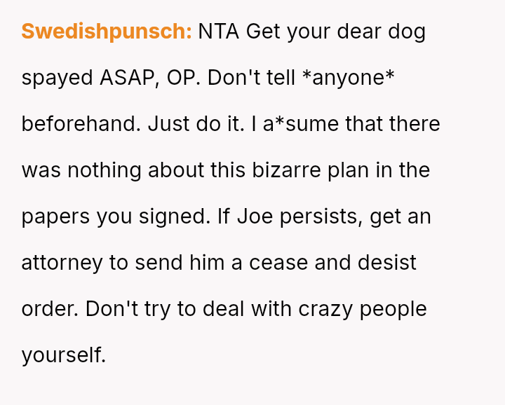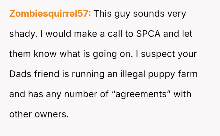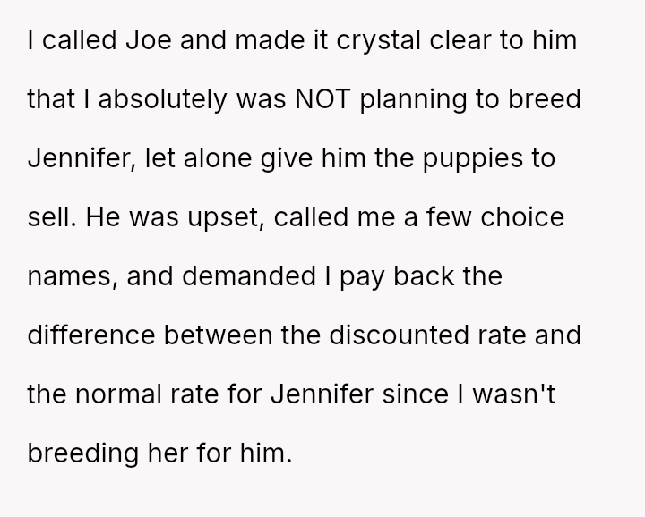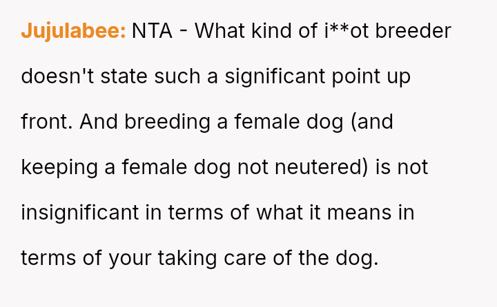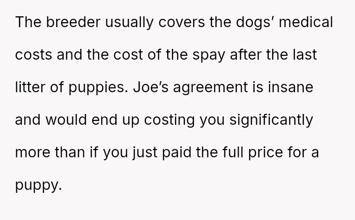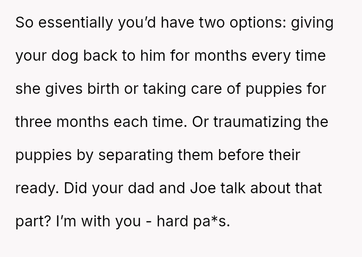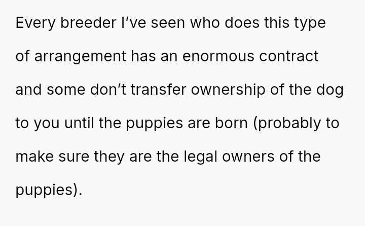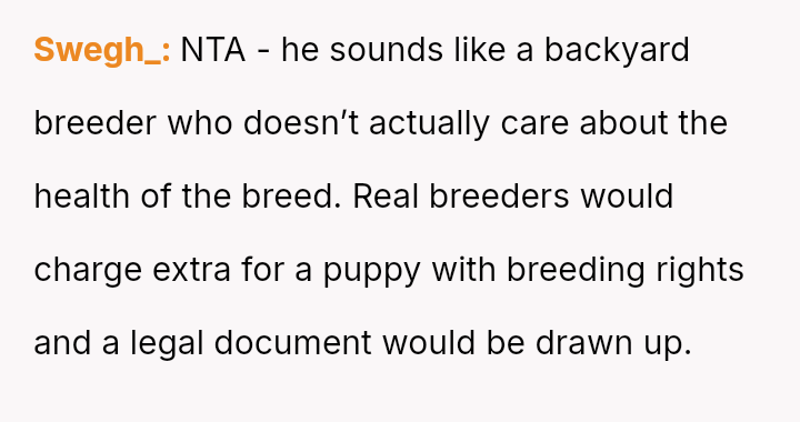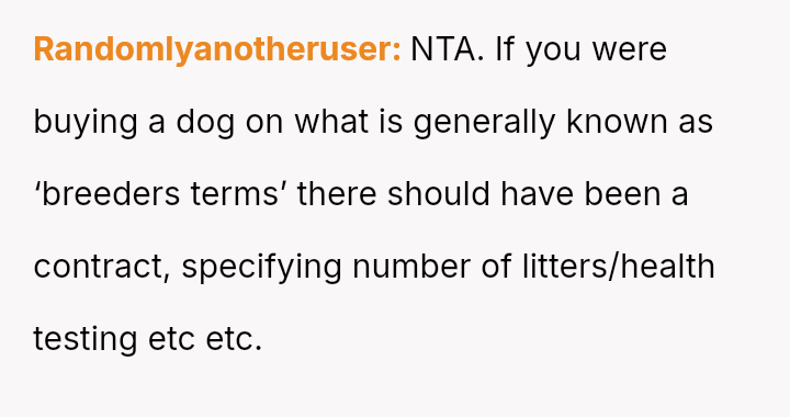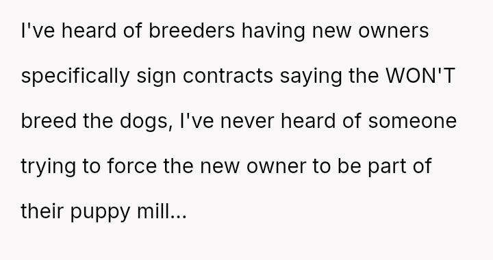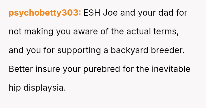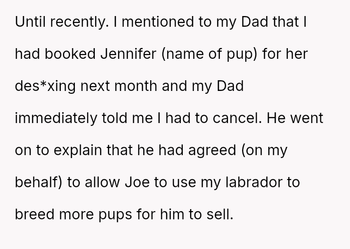 The original poster (OP) feels betrayed and cornered after discovering a secret breeding agreement allegedly made by their father on their behalf regarding a newly purchased puppy.