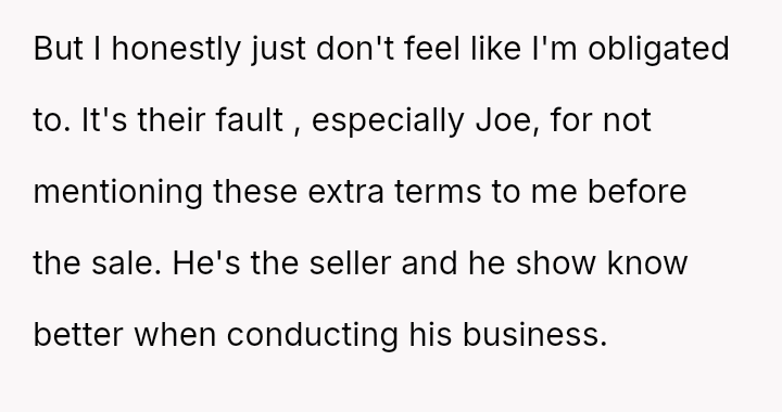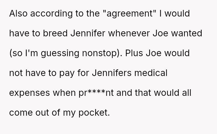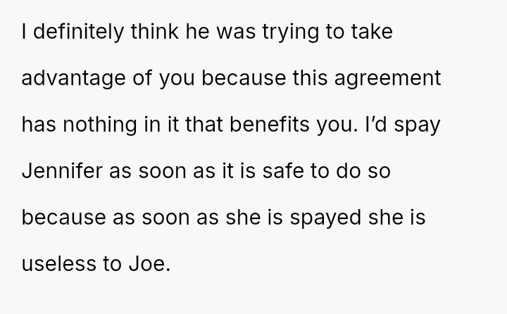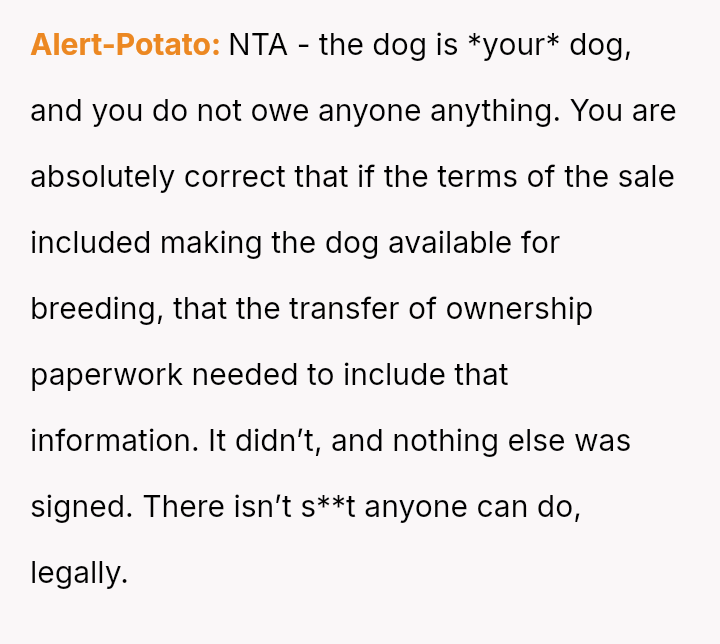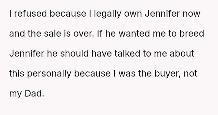 Given the lack of consent and the significant personal obligations involved in breeding, is the OP ethically or legally required to honor the undisclosed breeding agreement facilitated solely by their father, or does their legal ownership nullify any obligation to the seller, regardless of the initial discount?