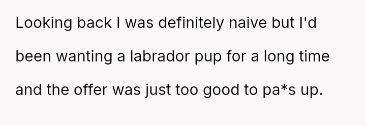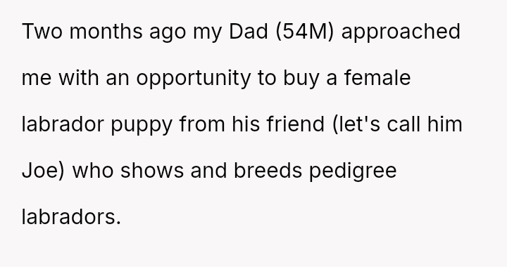 Two months ago, a young woman’s long-held dream came true when her father offered her a chance to buy a female Labrador puppy from his friend Joe, a respected breeder.
