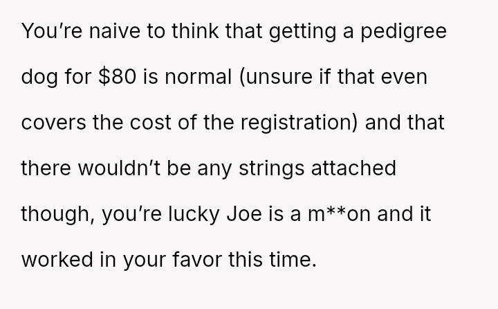 The central conflict lies between the OP's a*sertion of legal ownership and personal autonomy—refusing to adhere to unagreed-upon terms—and the expectations set by the seller (Joe) and the OP's father, who believe the heavily discounted price implied a binding obligation to use the dog for breeding purposes.