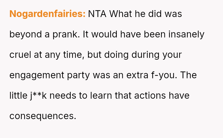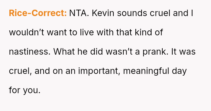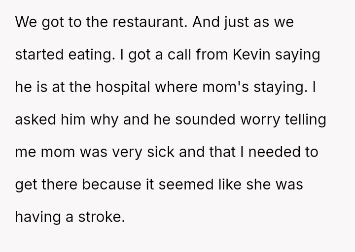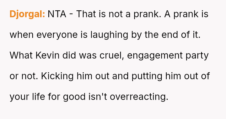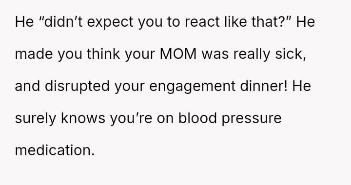 The original poster (OP) was significantly distressed by his stepbrother Kevin's malicious prank, which involved falsely reporting a medical emergency concerning the OP's hospitalized mother during the OP's own engagement celebration.