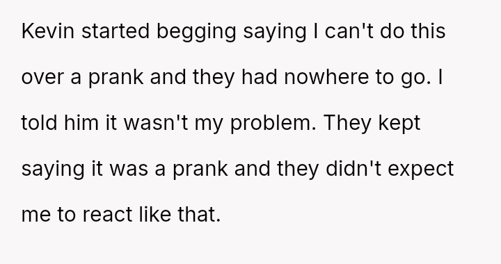 The central conflict lies between the OP's necessary action—immediately evacuating the celebration to address the supposed crisis—and Kevin's justification of the prank as 'evening the score' for not being invited, ignoring the severe emotional and health risks posed to the OP.