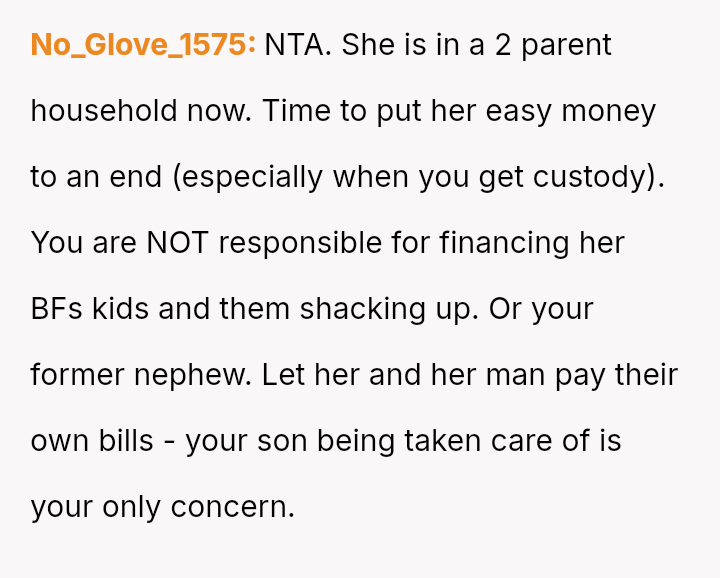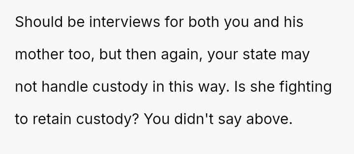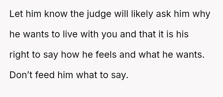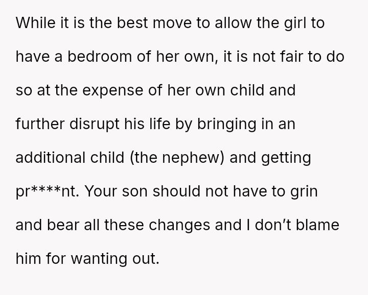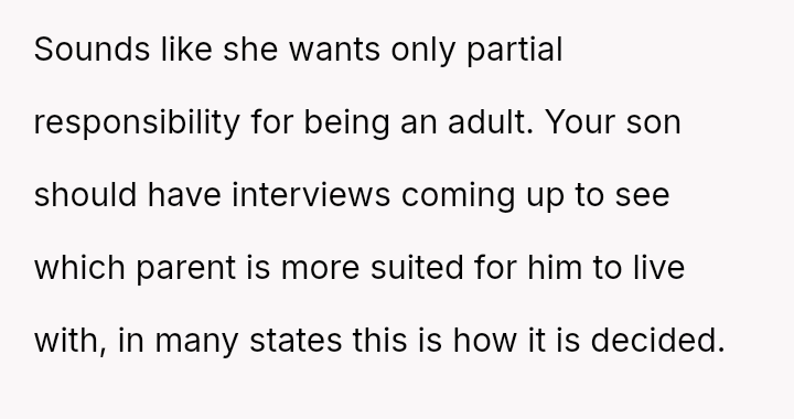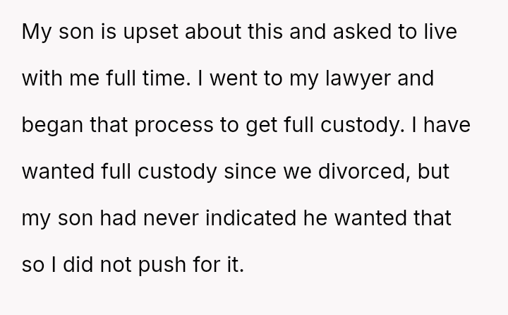 This arrangement resulted in the OP's son and his cousin sharing a room, which prompted the son to request living with the OP full-time. The OP then initiated legal proceedings to seek full custody, which he had previously considered but not pursued.