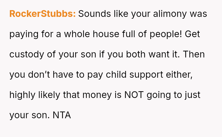 The Original Poster (OP) is facing a conflict where his desire to secure full custody for his son, driven by the son's unhappiness with the living situation, clashes with the financial distress experienced by his ex-wife following the termination of alimony payments.