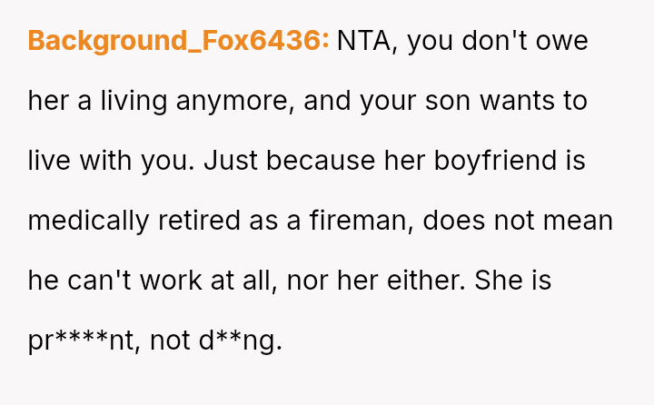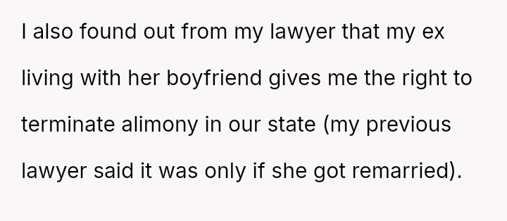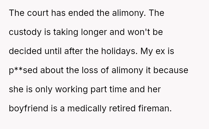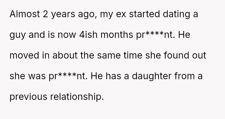 Recently, the ex-wife began a relationship, became pr****nt, and moved her new boyfriend (who has a daughter) into the home.