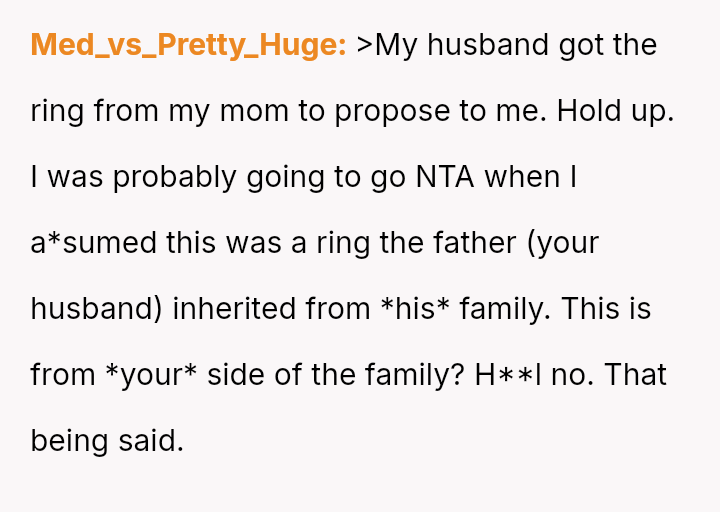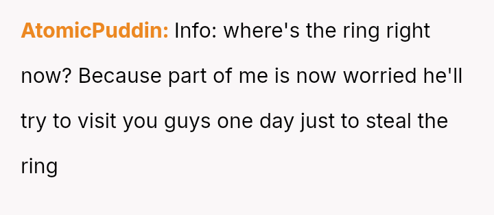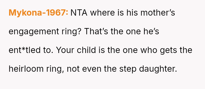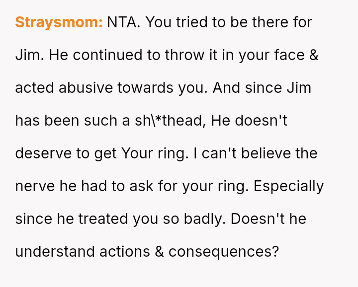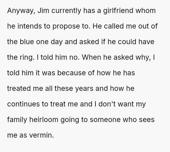 The original poster (OP) is facing significant conflict stemming from her refusal to give a family heirloom ring to her stepson, Jim, due to his years of hostile and disrespectful behavior toward her.