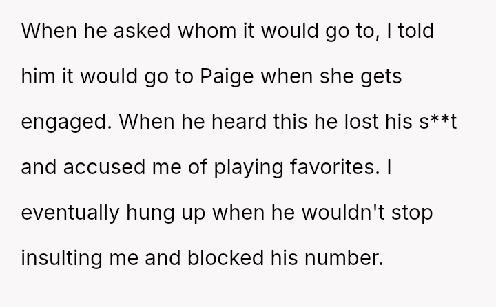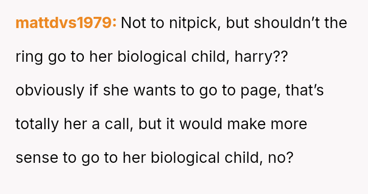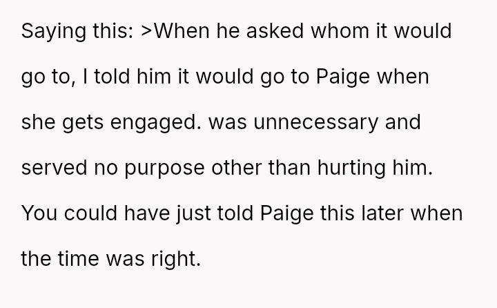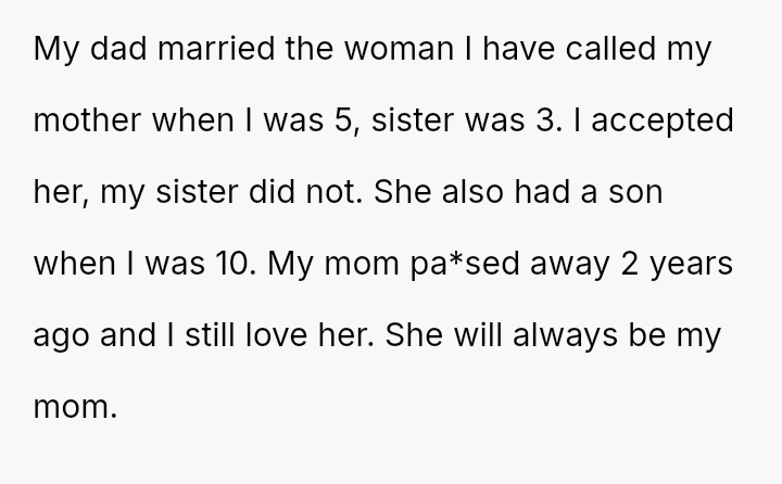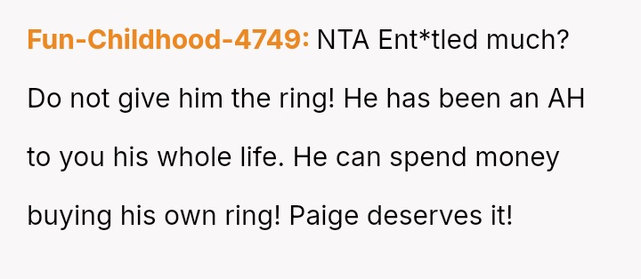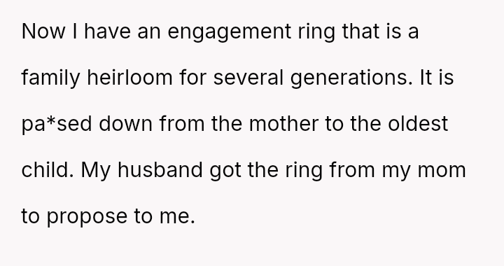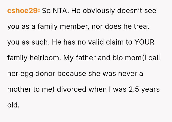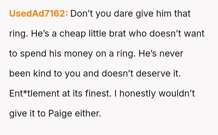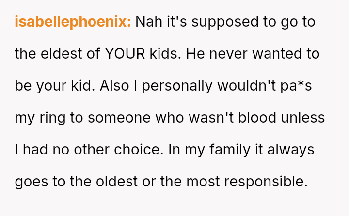 While the OP acted as a maternal figure and made significant efforts in raising him, Jim consistently rejected her authority and treated her poorly, contrasting sharply with the positive relationship he has with his sister, Paige, who calls the OP 'mom.' The central conflict is the OP upholding her personal boundary regarding the ring distribution versus Jim's expectation, supported by his maternal relatives, that he should receive the heirloom based on birth order.