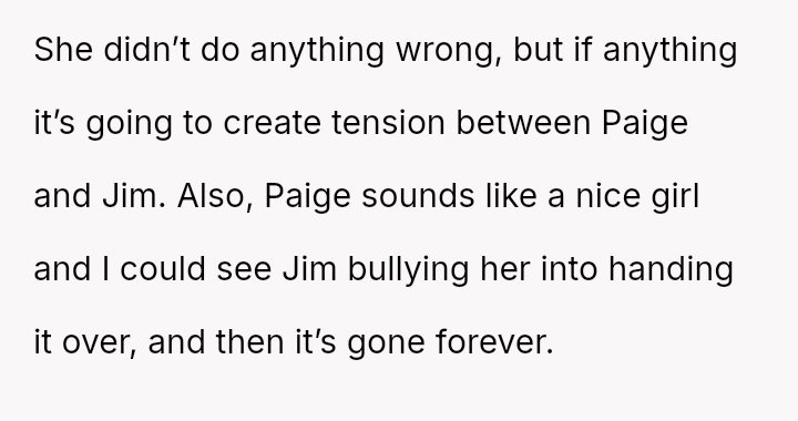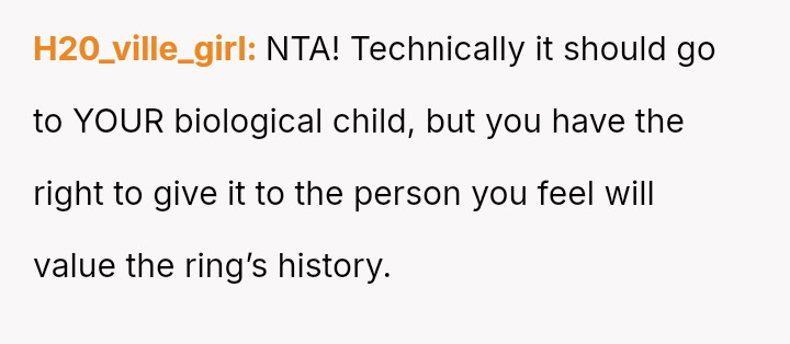 Considering the OP's es**blished role, her clear documentation of Jim's mistreatment, and the ring's symbolic value, should the OP prioritize birth order tradition and appeas**ent, or is she fully justified in gifting a personal heirloom based on demonstrated respect and relationship quality?