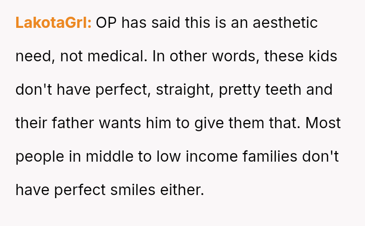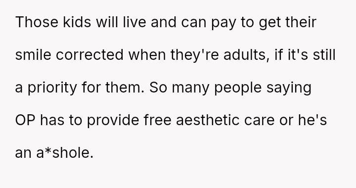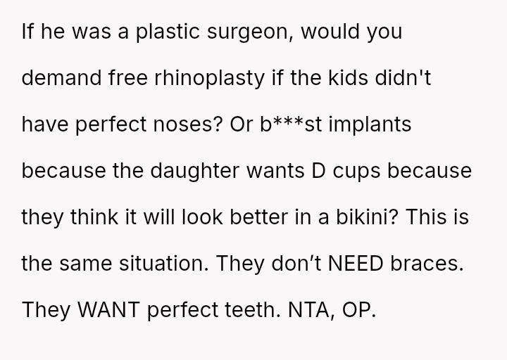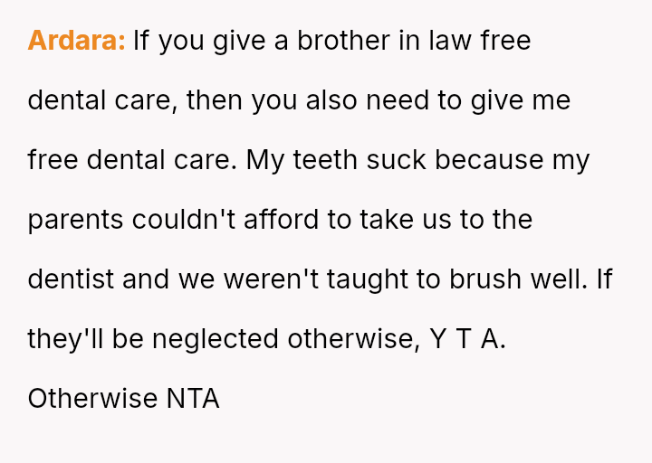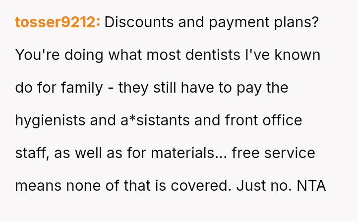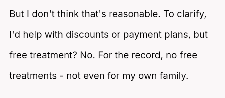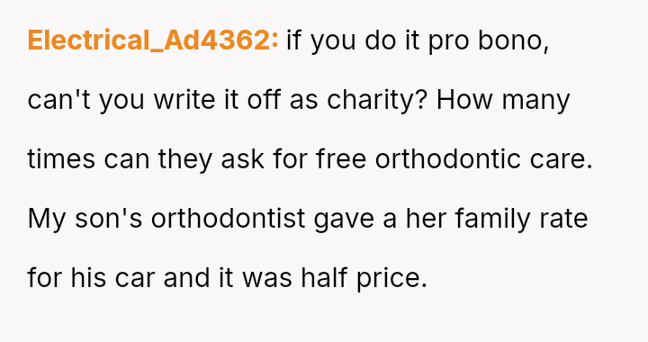 The original poster (OP) is facing significant conflict because they upheld a professional boundary regarding offering free orthodontic services to family, prioritizing professional fairness and consistency over familial financial need.