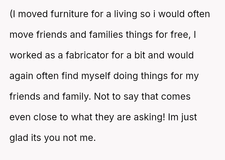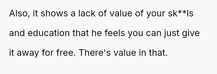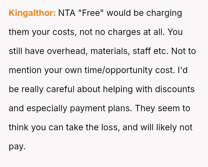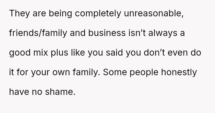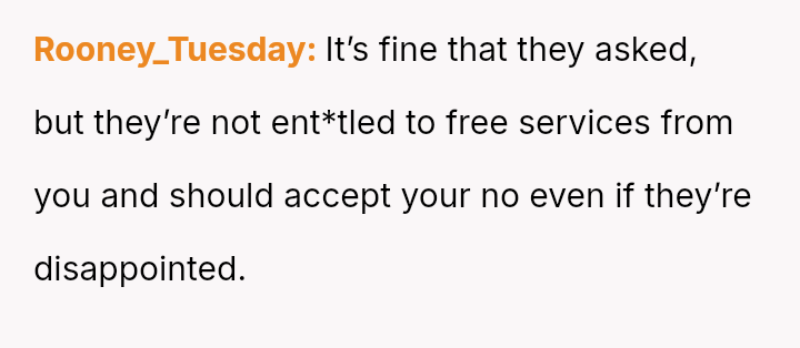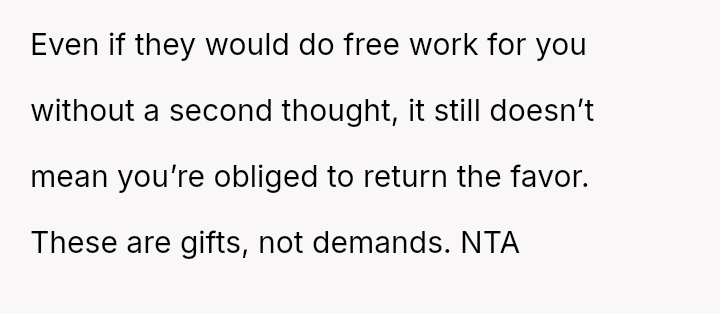 Is the OP justified in maintaining a strict 'no free work' policy for professional consistency, even when facing accusations of selfishness from financially struggling relatives, or should familial obligation and financial s**bility mandate an exception to their professional practice rules?