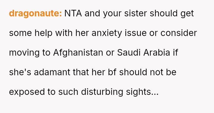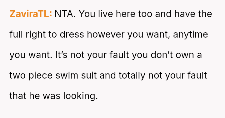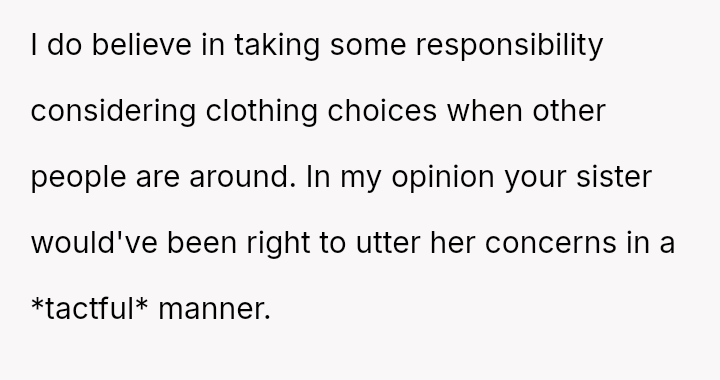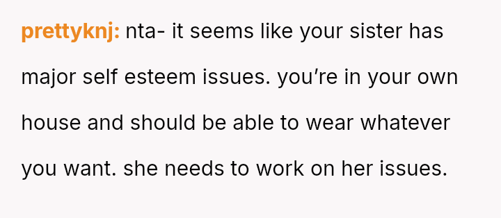 Given these opposing viewpoints—personal autonomy in one's own space versus respecting a sibling's relationship boundaries—is the OP entirely correct to refuse changing their clothing habits, or did they have a responsibility to moderate their dress out of respect for the sister's feelings and relationship security?