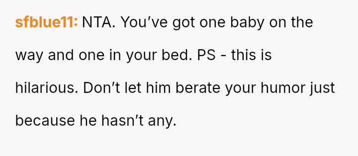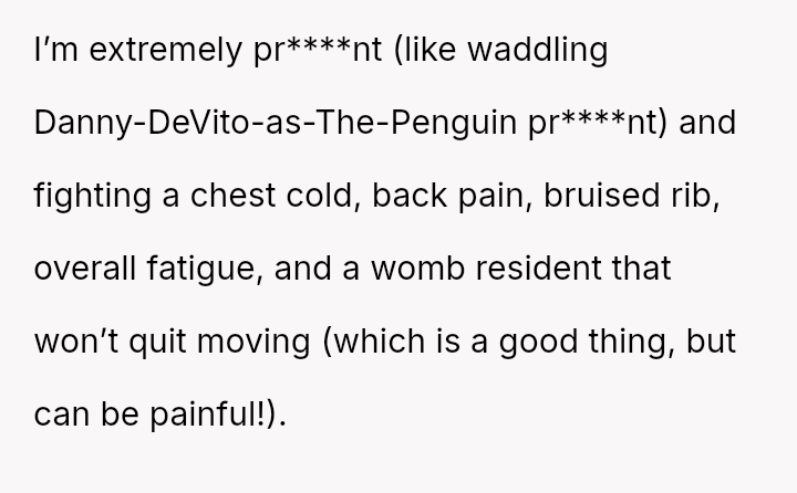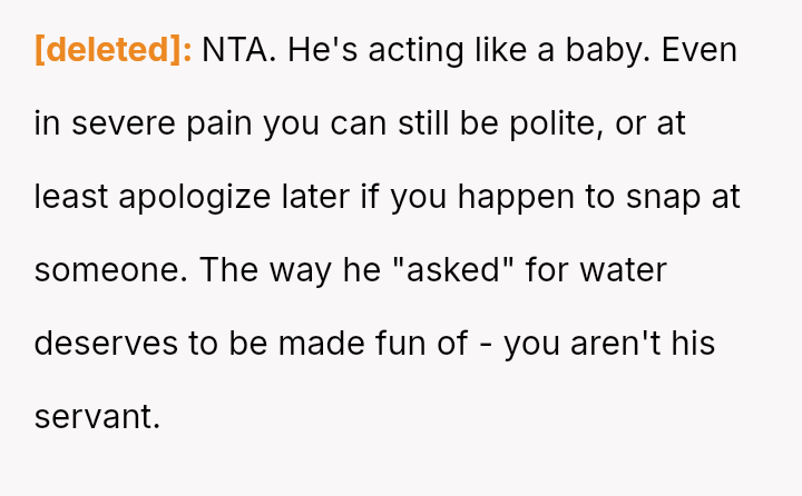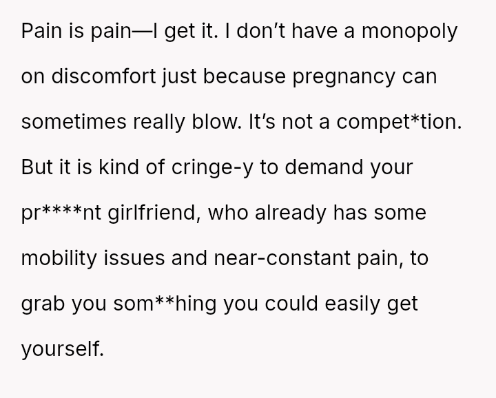 The original poster (OP) felt justified in making a dark joke about her boyfriend's seemingly minor request for water, given her own significant physical discomfort from late-stage pregnancy and existing pain.