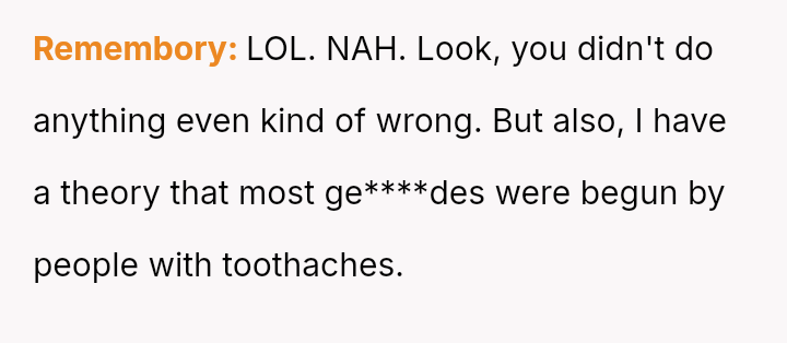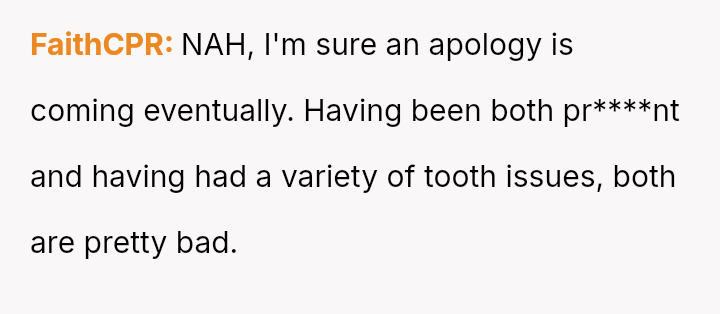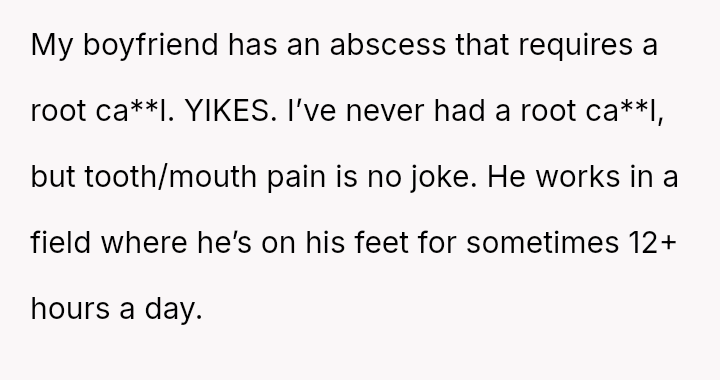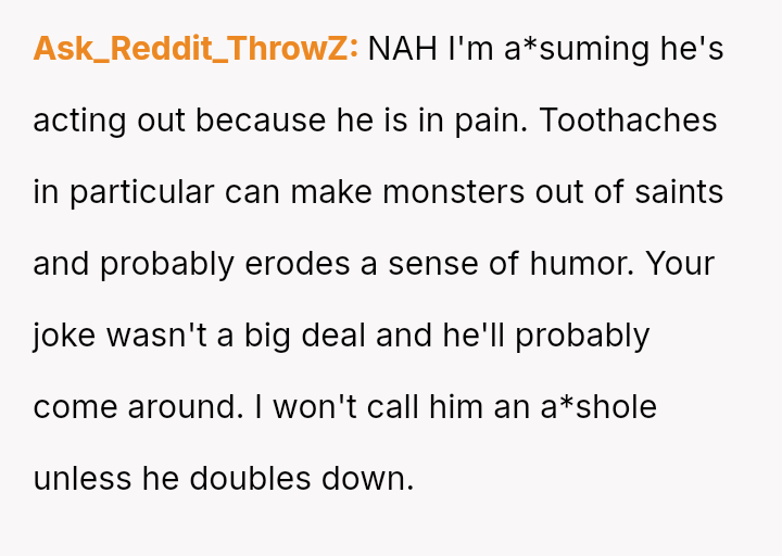 The central conflict arises from the clash between the OP's desire to express frustration through humor and the boyfriend's sensitivity to her joke while recovering from a painful dental procedure.