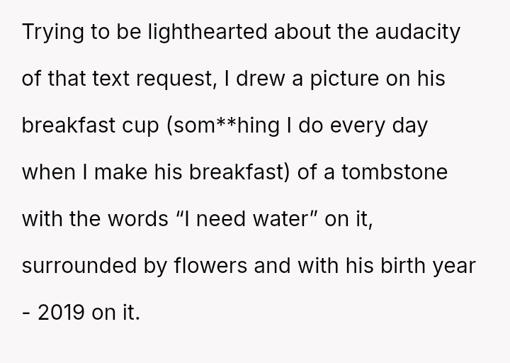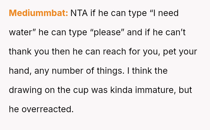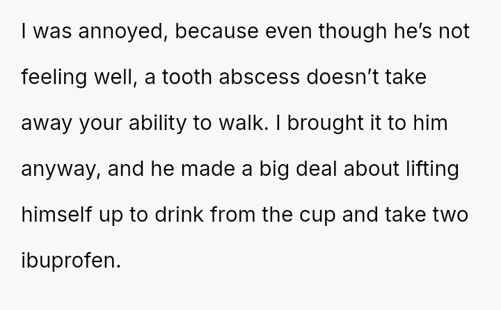 Was the OP wrong to use dark humor on a breakfast cup to comment on her boyfriend's perceived exaggeration of his need for a*sistance, or was the boyfriend justified in feeling hurt by a joke mocking his dependency during a genuine health crisis?