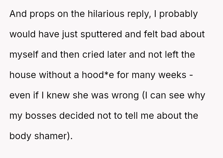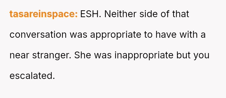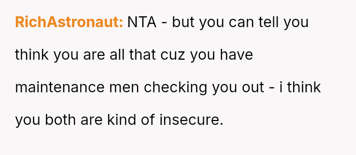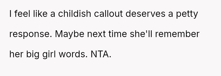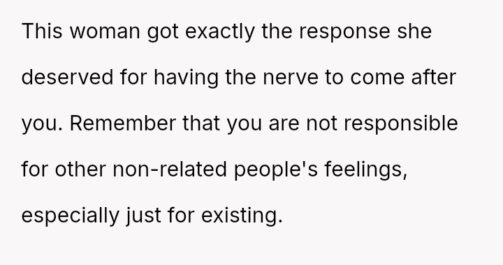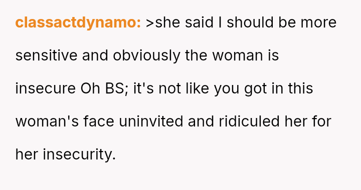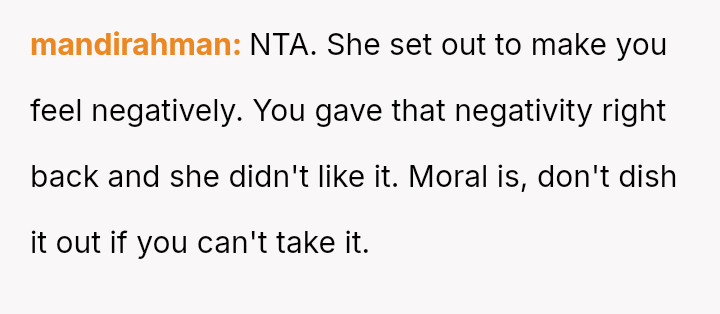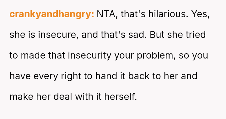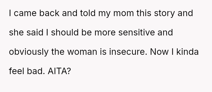 The OP's initial feeling of righteous defense has now been complicated by self-doubt after their mother suggested they should have shown more sensitivity to the neighbor's apparent insecurity.