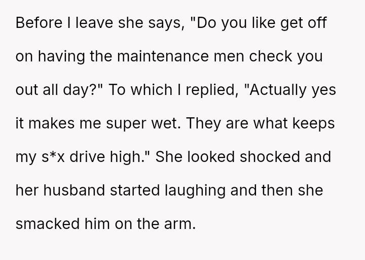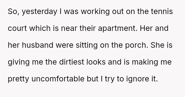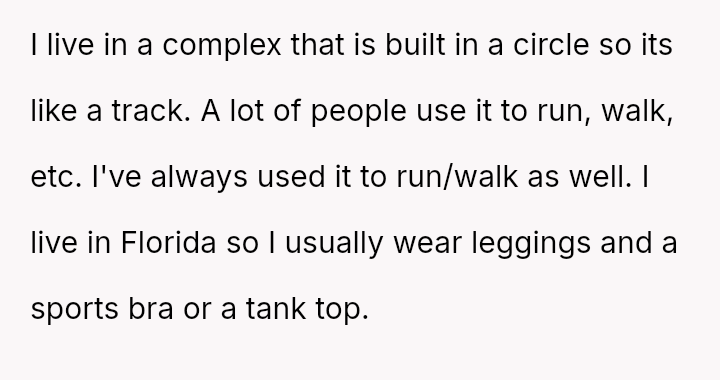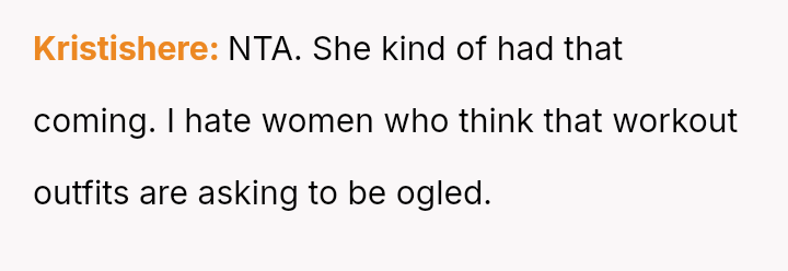 The original poster (OP) faced persistent, judgmental scrutiny from a neighbor regarding their choice of workout attire, which led to a deliberately provocative verbal confrontation.