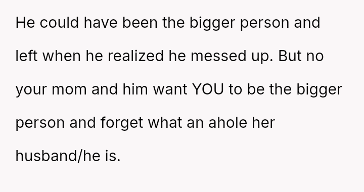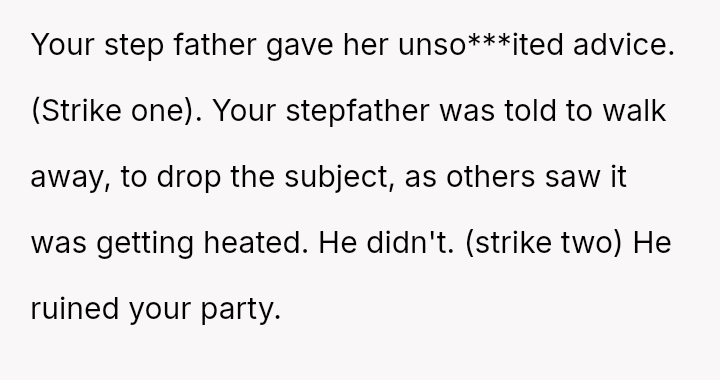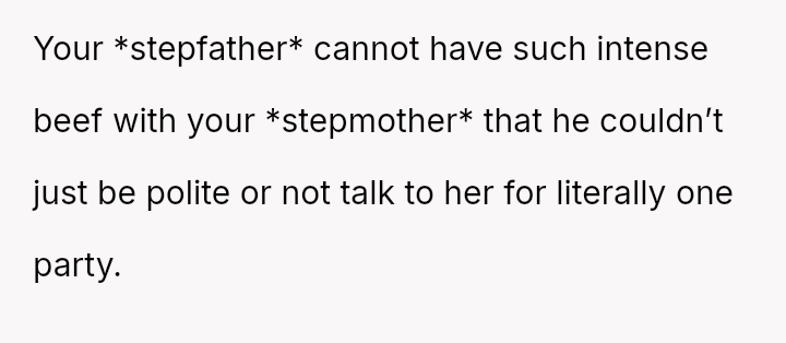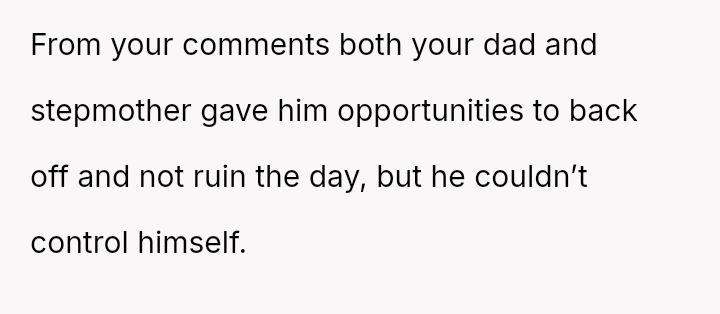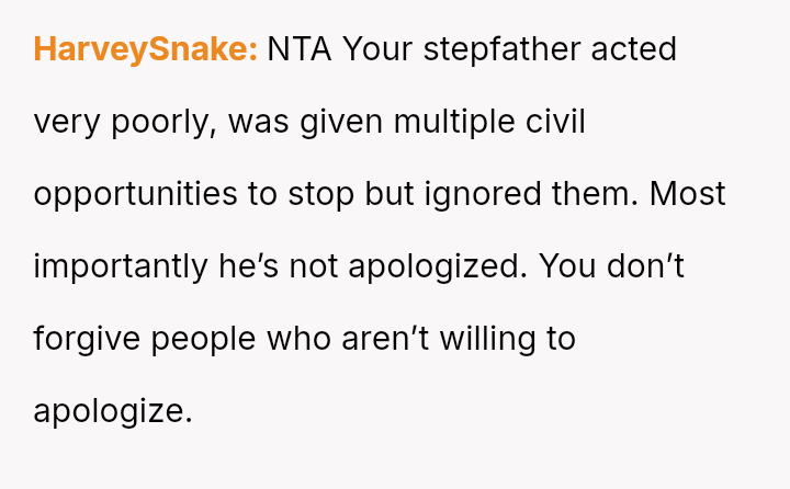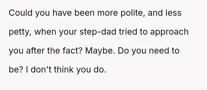 Given the OP's firm stance on accountability versus the family's desire for reconciliation, the central question remains: Is the OP justified in indefinitely holding the stepfather responsible for ruining a major life event, or does the pursuit of familial harmony require them to eventually move past the incident, even if both parties acted poorly?