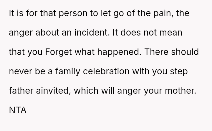 The OP is clearly prioritizing their sense of justice and the respect owed to their milestone celebration over their mother's desire for reconciliation and peace, leading to ongoing conflict and refusal to forgive the stepfather.