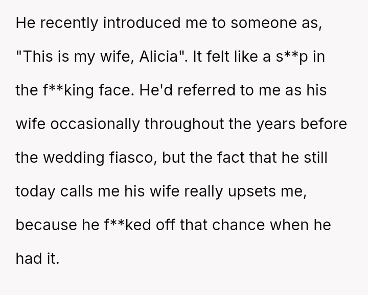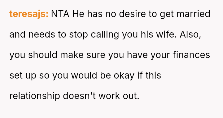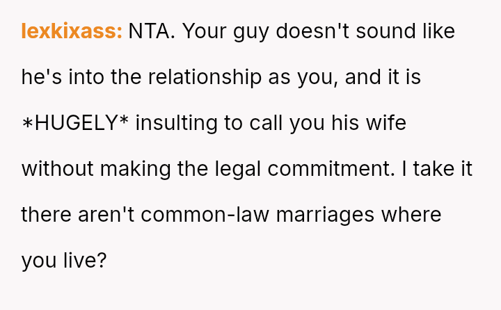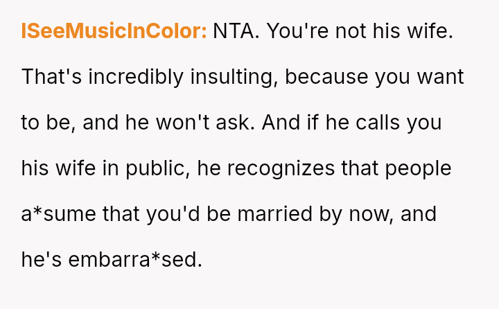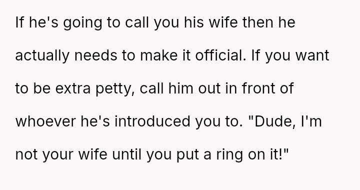 Given that the boyfriend is happy to call her his wife casually but actively avoided the legal commitment when the time came, is the OP justified in demanding he stop using the t*tle 'wife' now, or is this demand another form of pressuring him toward the marriage he explicitly rejected?