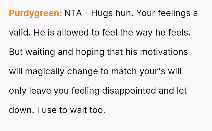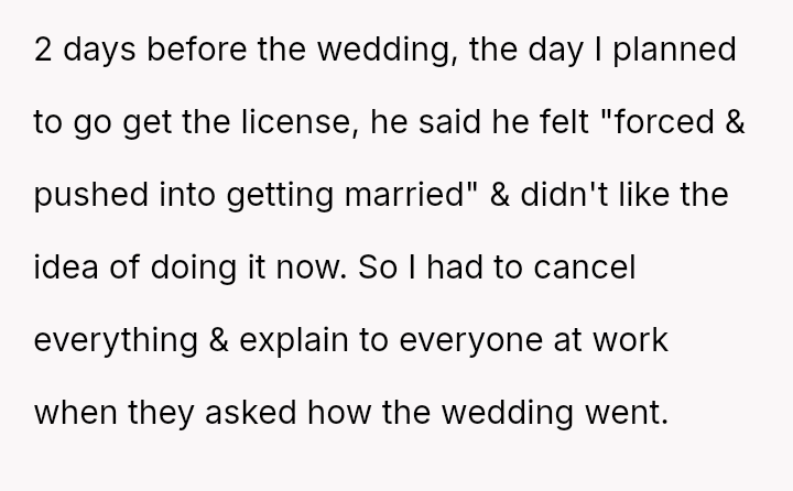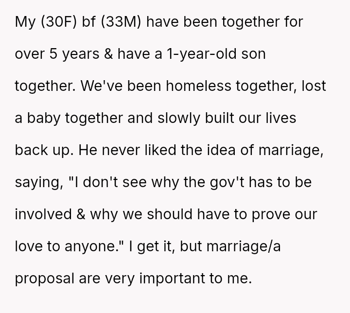 The original poster (OP) is deeply conflicted, feeling hurt and invalidated because her partner refused to follow through on a plan to legalize their long-term commitment, only to continue using the t*tle of 'wife.' This situation highlights a significant gap between the OP's need for formal commitment and her boyfriend's desire for a commitment-free partnership, despite their shared history and child.