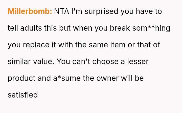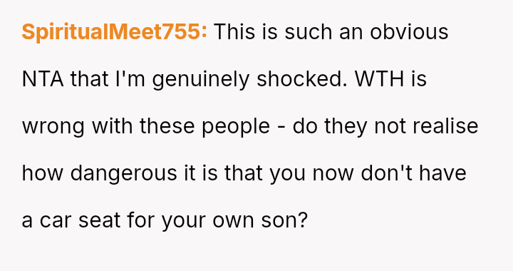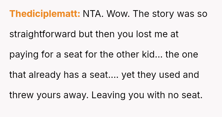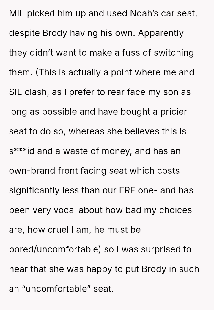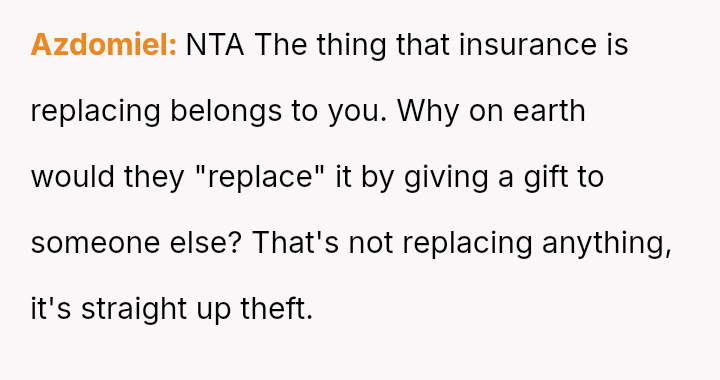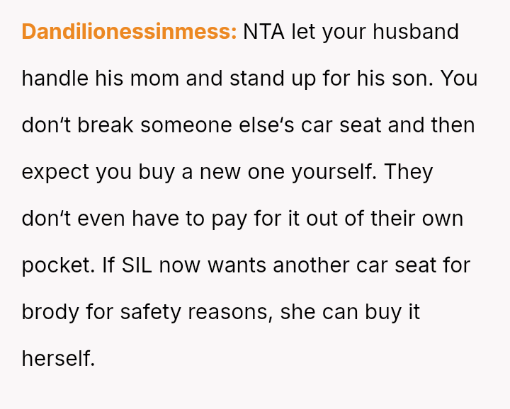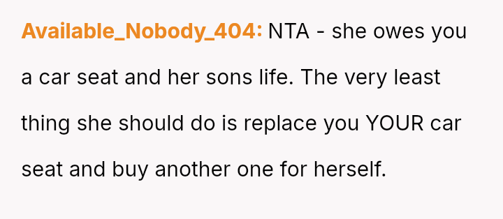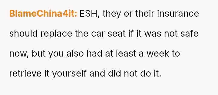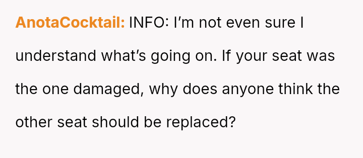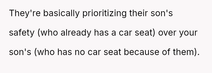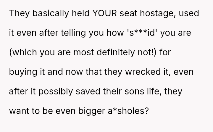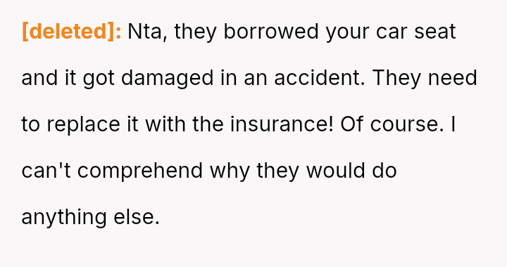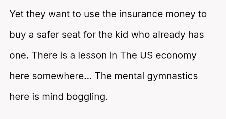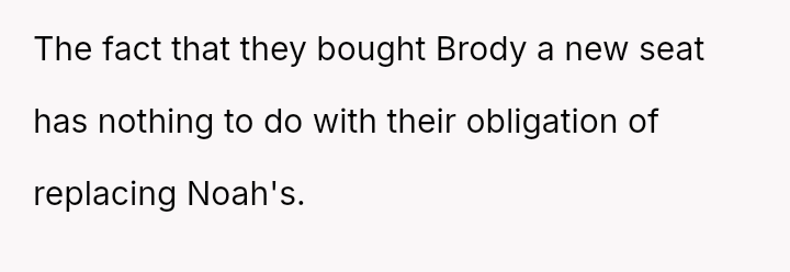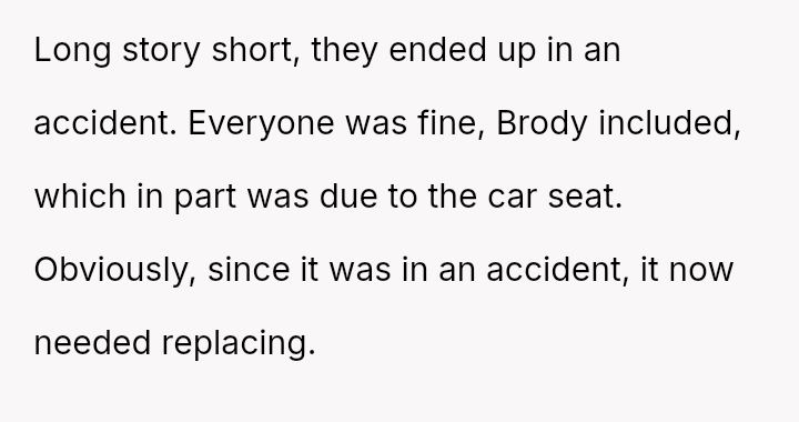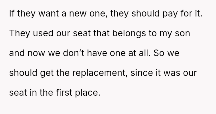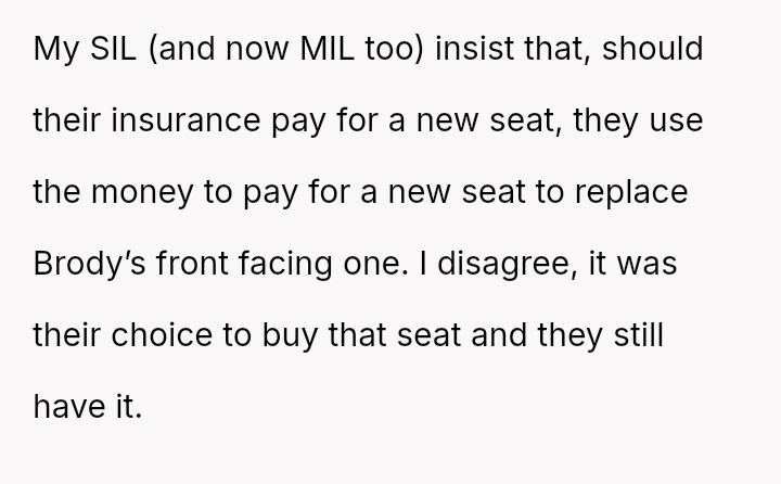 The core conflict stems from the disagreement over who should bear the cost of the replacement: the OP believes the insurance payout for the destroyed seat should go towards replacing their specific seat, while the in-laws insist the funds should be used to upgrade the child who was actually in the seat (Brody) to a new seat, effectively using the insurance money to upgrade their own equipment.