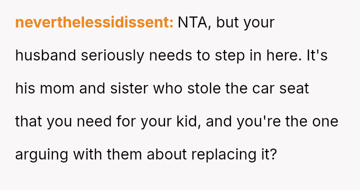 The original poster (OP) is in a difficult position, feeling justified in demanding a direct replacement for their expensive, safety-oriented car seat after it was damaged while being used by the sister-in-law's child.