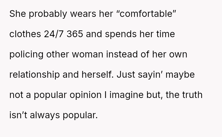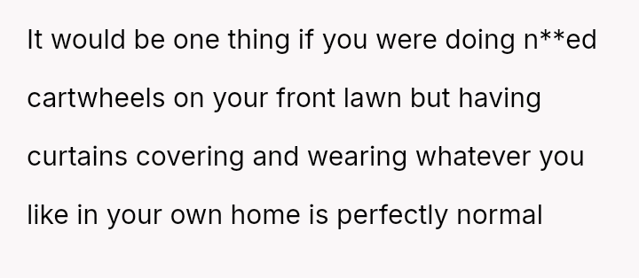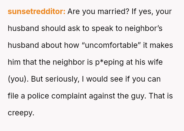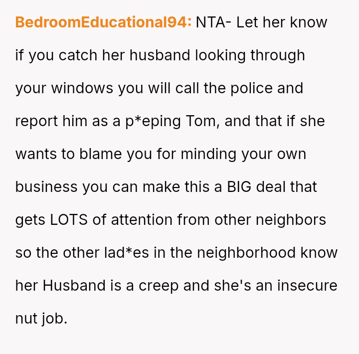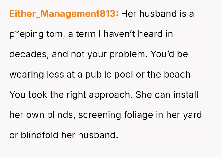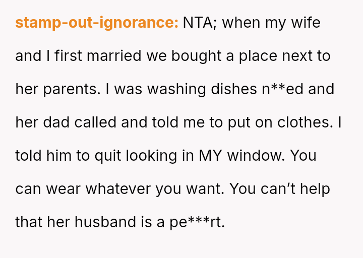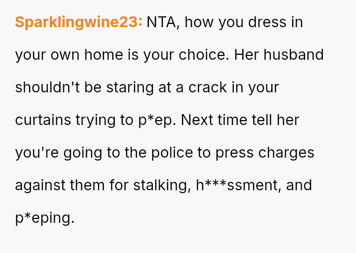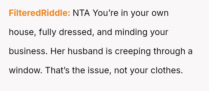 The OP defended their right to dress comfortably in their own residence and redirected concern toward the husband's v***uristic actions, which led to the neighbor becoming visibly angry.